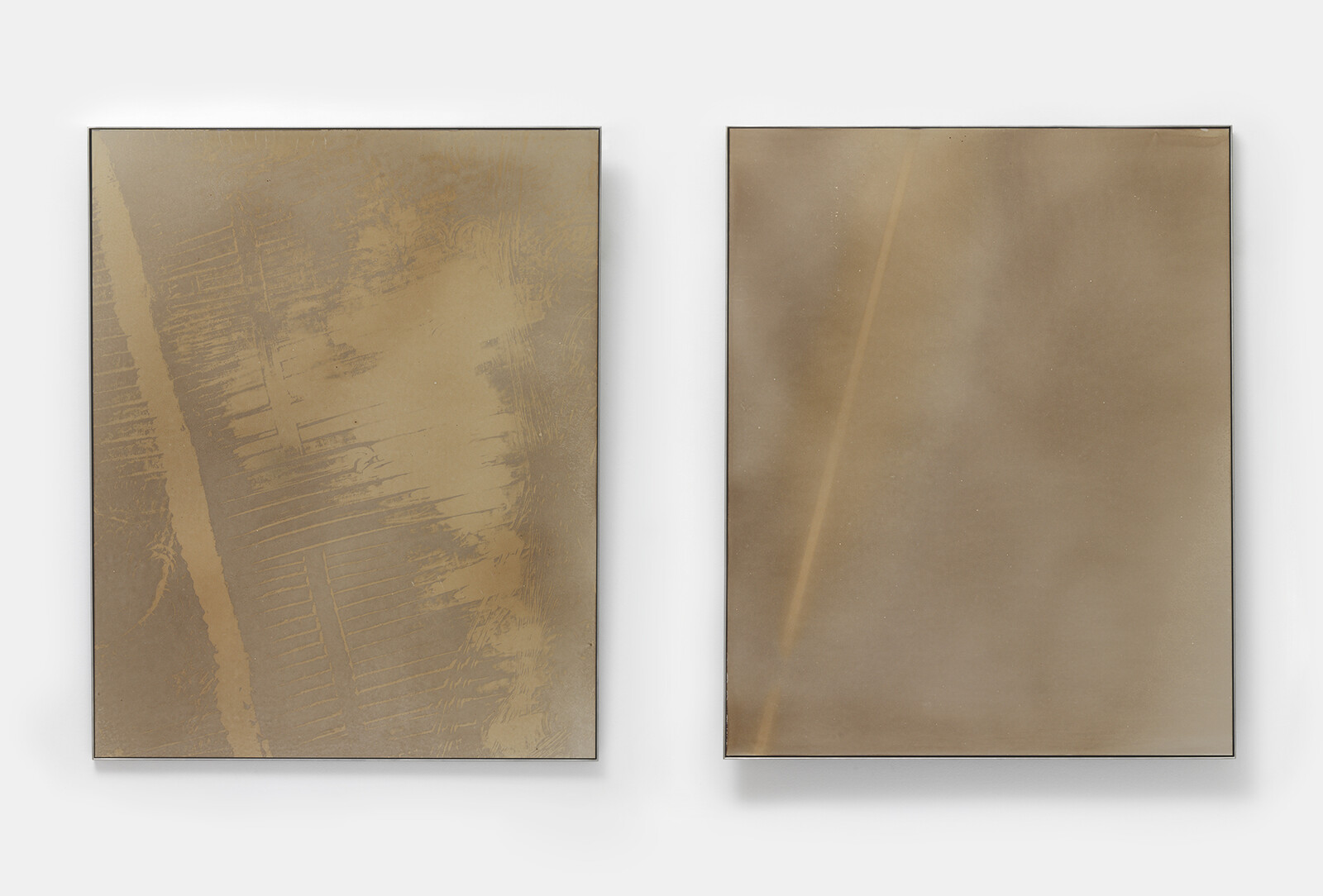 This series of photographic works by Julian Charrière employs the medium’s oldest technique first developed by French inventor Nicéphore Niépce in 1822. Using bitumen collected from the oil fields in Fort McMurray, Canada, a light-sensitive emulsion has been created to process images taken at the oil fields onto polished stainless-steel plates. Each piece is a diptych of one aerial shot and one long exposure to the late summer, Canadian light by way of Camera Obscura. Numbers featured in the title correspond to the geographic coordinates where the photographs were taken. The series stands as a conceptual mise en abyme: a view of and from the flow of hydrocarbons, addressing their impact on our modern powers of visualization through a return to material sources.