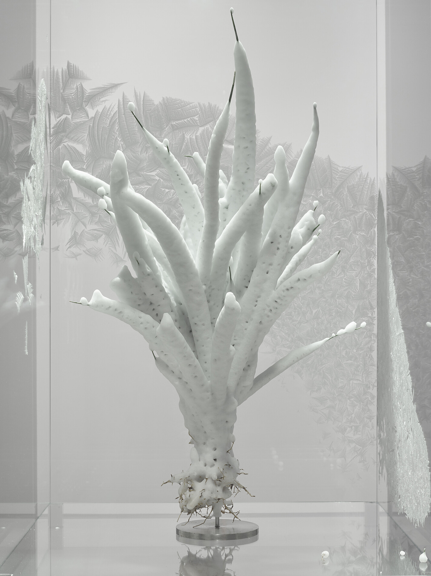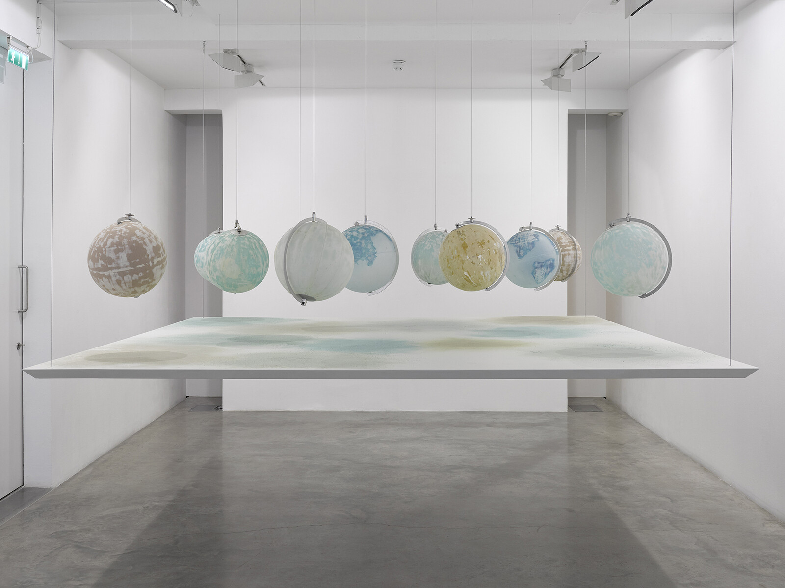 In the upper gallery, three installations make connections between past and future via the fleeting present. While raising existentialist questions they also have an ethereal beauty. In a series of large photographs, The Blue Fossil Entropic Stories, 2013, Charrière is seen as a fragile silhouette melting the iceberg beneath his feet with a blowtorch. The image acts as a catalyst, a projection surface, inviting every spectator to imagine being the protagonist. In We Are All Astronauts, 2013, various globes, ranging from 1890 to 2011, appear to float over a large table. The artist has eliminated geopolitical divisions between countries, continents and people by sanding the surface of each globe and allowing their dust to intermingle on the table top. He uses an ‘international sandpaper’ he produced from mineral samples gathered from all countries recognised by the United Nations. Finally, Tropisme, 2015, displays several plants known to have existed during the Cretaceous period. Shock-frozen at –196 ̊ centigrade by being dipped in liquid nitrogen, the plants are displayed in a sealed glass vitrine and kept refrigerated at –20 ̊C. As long as these plants from 65 million years ago are kept frozen and cared for by humans, they will continue to represent an interface between past and future.
