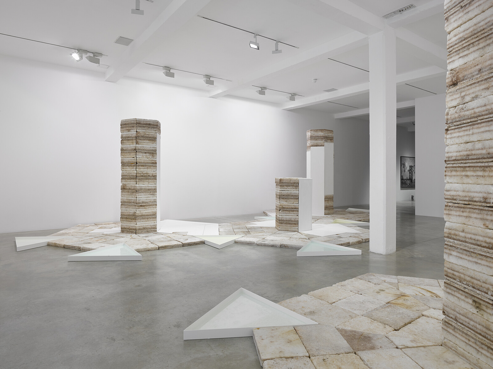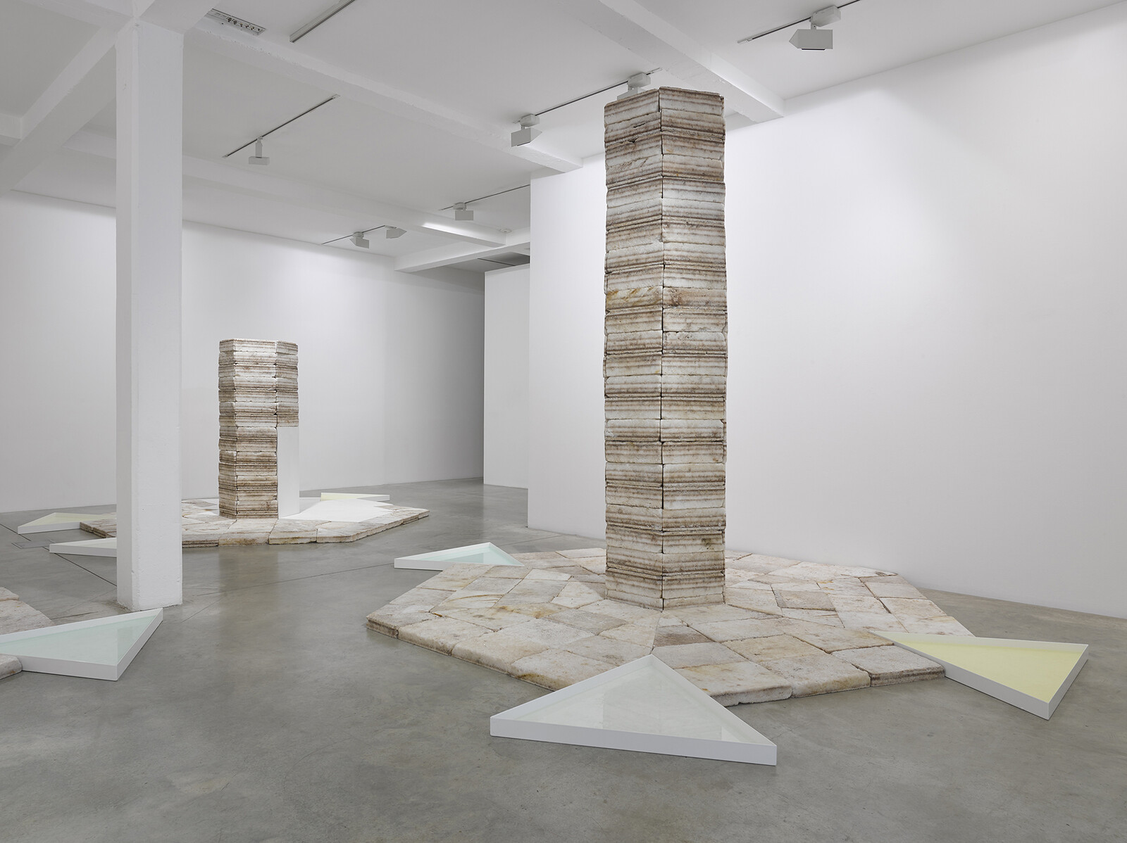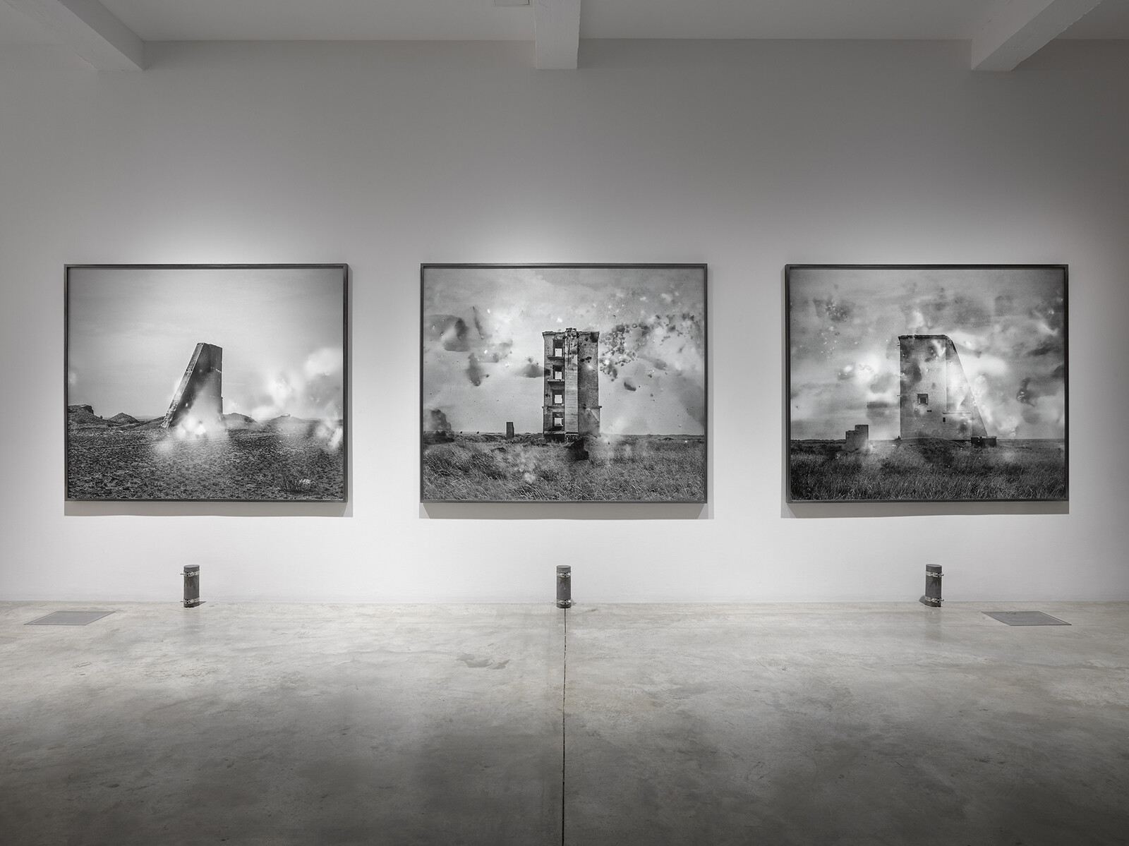Among the several installations exhibited at Parasol unit is Future Fossil Spaces, 2014, a large configuration of thick salt bricks extracted from the Salar de Uyuni salt deposits in Bolivia, South America, a region now commonly referred to as the ‘lithium triangle’. The chemical element lithium is an essential part of the batteries that power our electronic devices. The film Somewhere, 2014, and the photographic series Polygon, 2015, document the devastation caused by human activity in Semipalatinsk, the site in Kazakhstan where, between 1949 and 1989, the Soviet Union conducted 456 nuclear tests. Charrière’s investigations for Polygon were prompted by J.G. Ballard’s short story, The Terminal Beach.