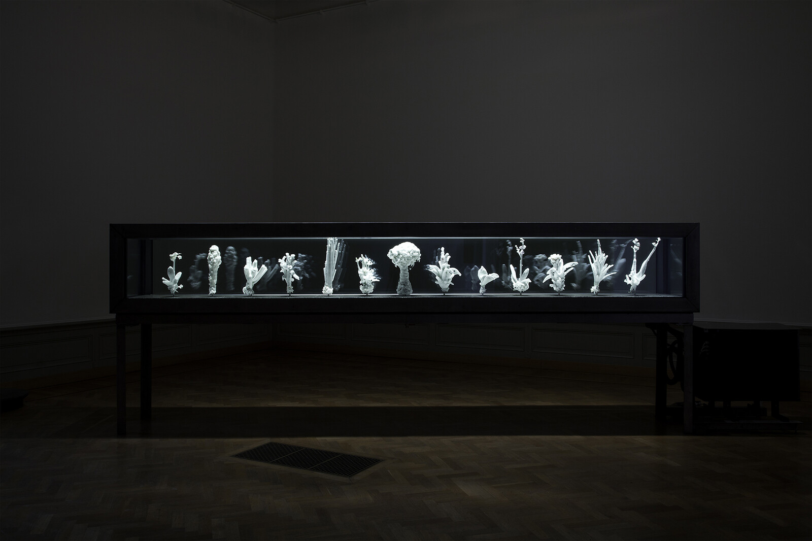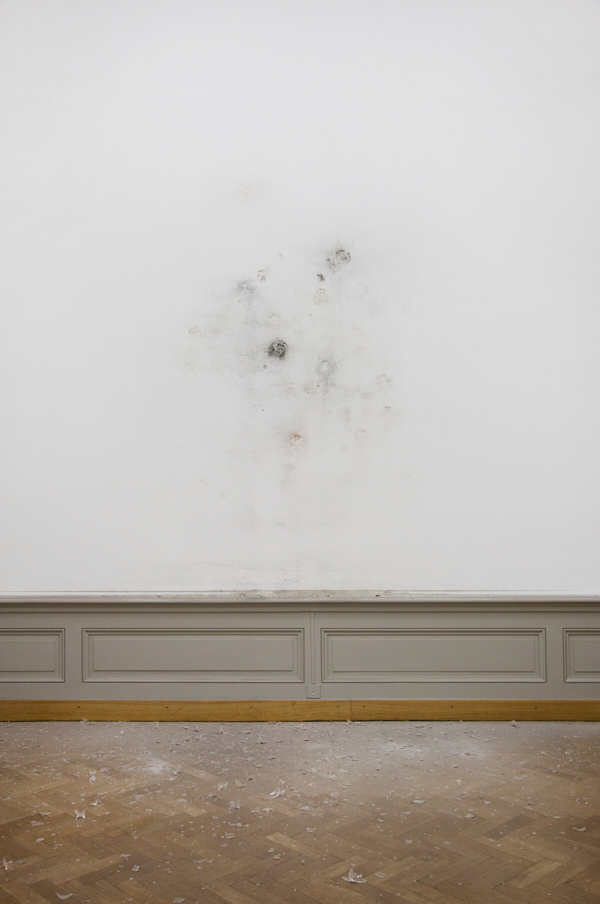 One of the works, the most understated in the exhibition, is entitled The Key to the Present Lies in the Future (2014). Twenty-four hourglasses containing sand from twenty-four geological periods are hurled by the artist against a wall of the Museum. All that is left of all those eras suddenly brought together in the same place and at the same time as a result of a powerful act are glass debris and sandy remnants. The hourglass itself is already a perfect metonymy of the link between time and space since it allows an interval of time to be measured by the movement of matter. The work echoes that of Robert Smithson, and in particular his thoughts on the issue of non-sites, and recalls one of his works in particular, Hypothetical Continent (Map of Broken Glass: Atlantis), created in 1969, a pile of glass fragments which make up the fictitious map of a lost continent.