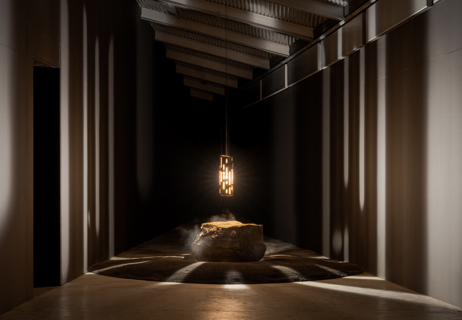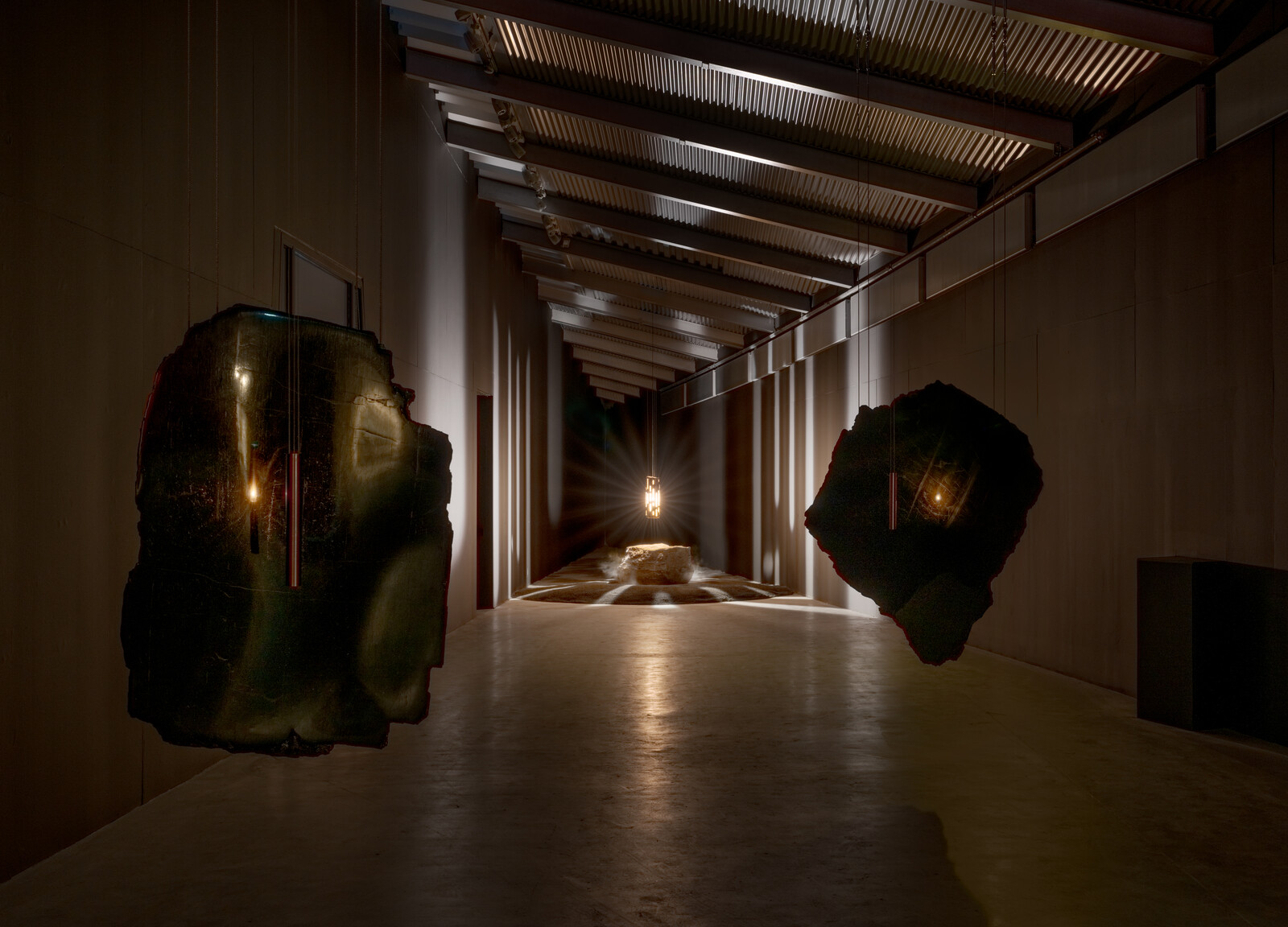 The installation Panchronic Garden (2022) recreates a Carboniferous forest, bringing ancient plants to life on a floor of anthracite coal. The film Controlled Burn (2022) builds on this theme, contrasting explosive pyrotechnics with images of derelict oil rigs and decommissioned cooling towers, showing how this journey began with the very plants in Panchronic Garden. The work A Stone Dream of You (2024) brings this meditation back to the origins of life itself, with lava stone sculptures that evoke the primordial beginnings of life emerging from geological forces.