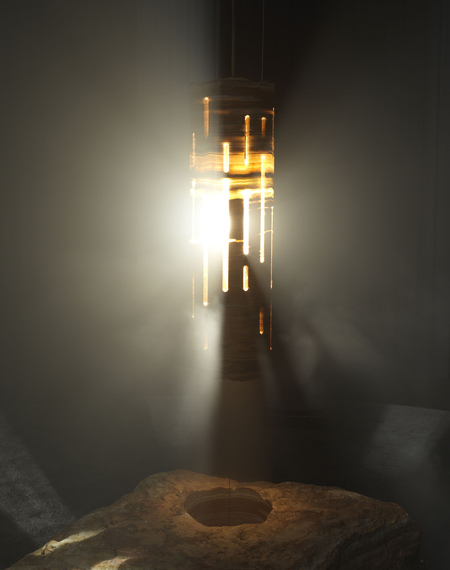 The second part of the exhibition in an immersive scenography, centered around an igneous dream-machine (Vertigo, 2021). Set amid an ensemble of curtains, haze, and a fountain, Charrière remixes the tripped-out spirit of Brion Gysin’s original device (1962) for our twenty-first-century crisis. The first historical object was a rotating metal cylinder out of which beams of light were shot through various apertures. The visual stimuli given out by its stroboscopic flickering (meant to be viewed through closed eyelids) was supposed to produce an alpha wave mental state in the user. Building on such play of flash and darkness, Charrière’s stone version incorporates an architectural element to facilitate group sleep. Here, in the round, users must rest their heads on mineral pillows in order to receive the vision—a hard or otherwise disciplined version of repose and revelation in tune with our times.