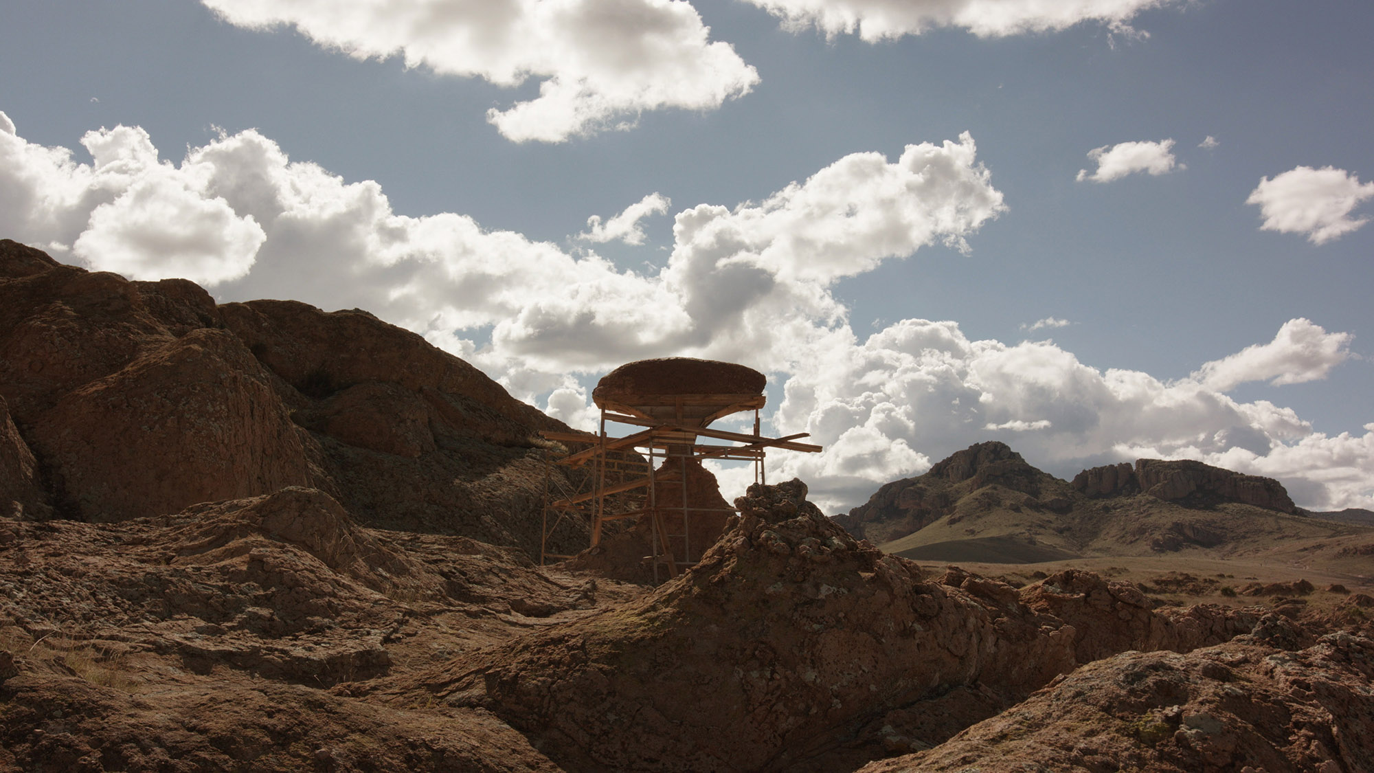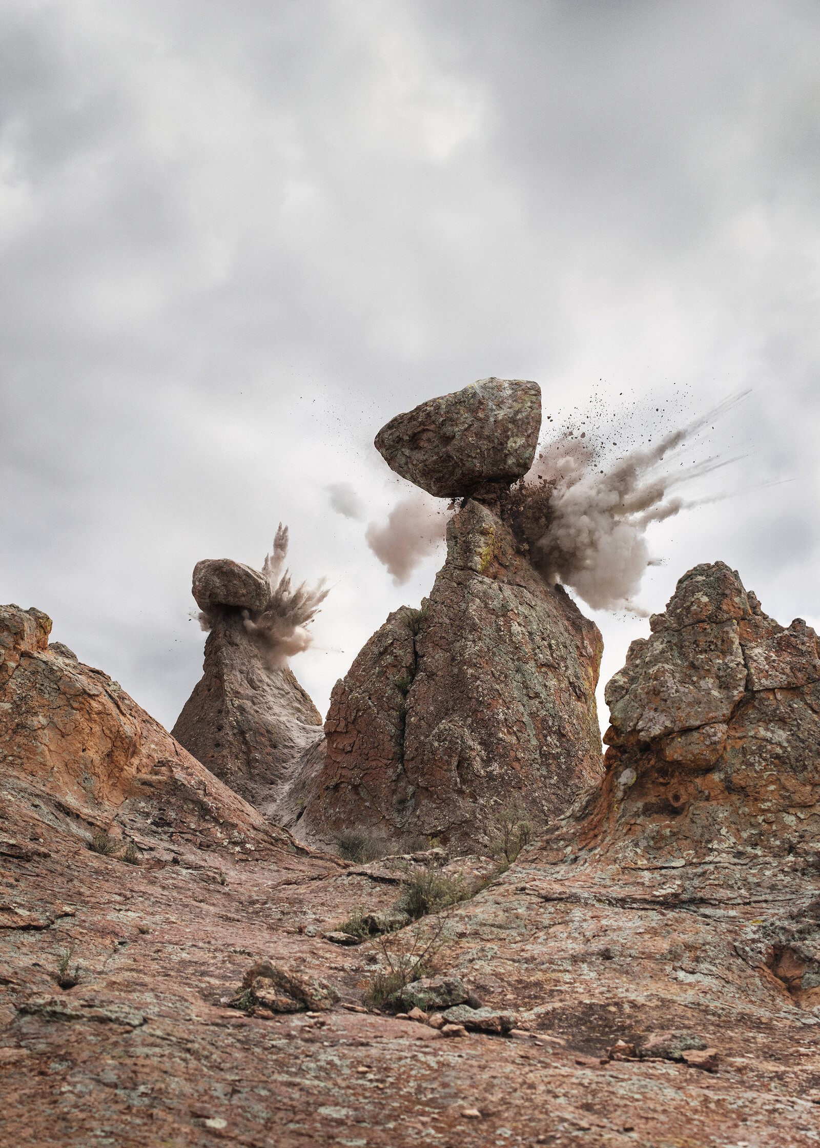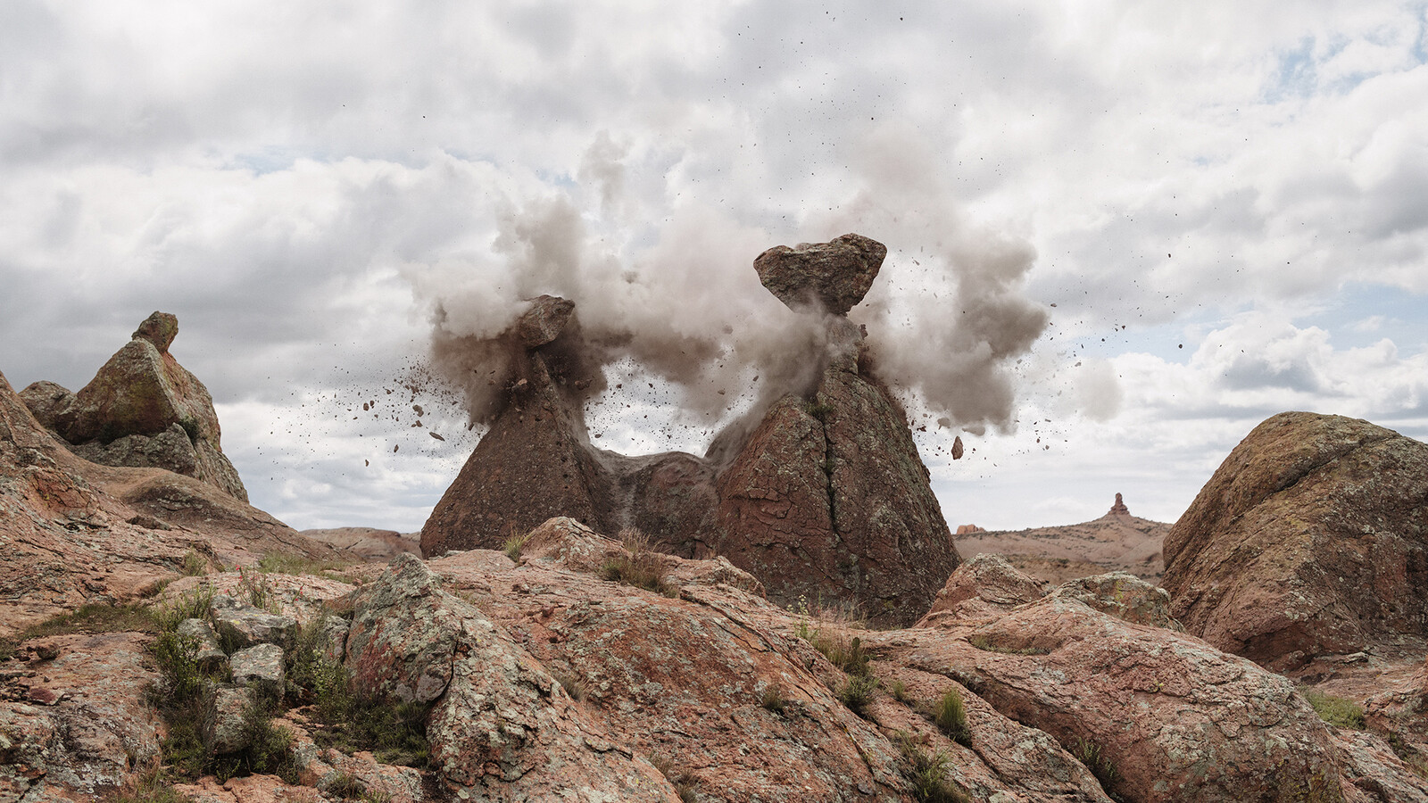 In a staged terrorist act, the two artists Julian Charrière and Julius von Bismarck blow up a vaulted rock formation. A video recorded with a mobile phone shows the masked "perpetrators" on the run to safety. The actual explosion of the arch, however, does not take place in Utah as faked, but in Mexico, with an artificial counterpart. In a very detail-oriented process, the arch is reproduced with colored concrete. The explosion is staged in a controlled manner with the help of a local production team.