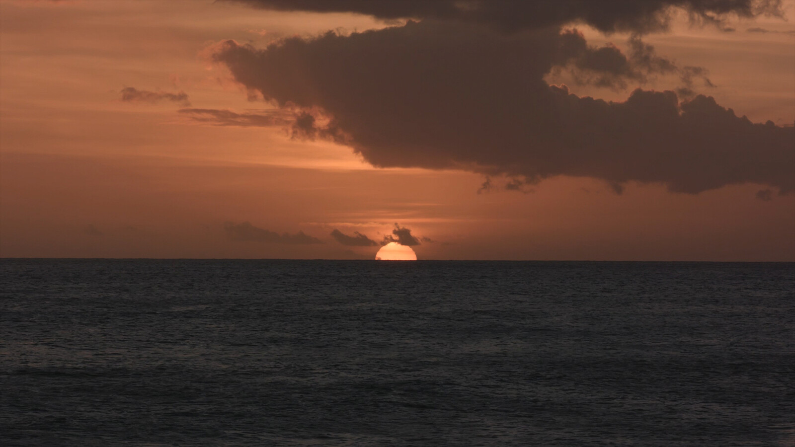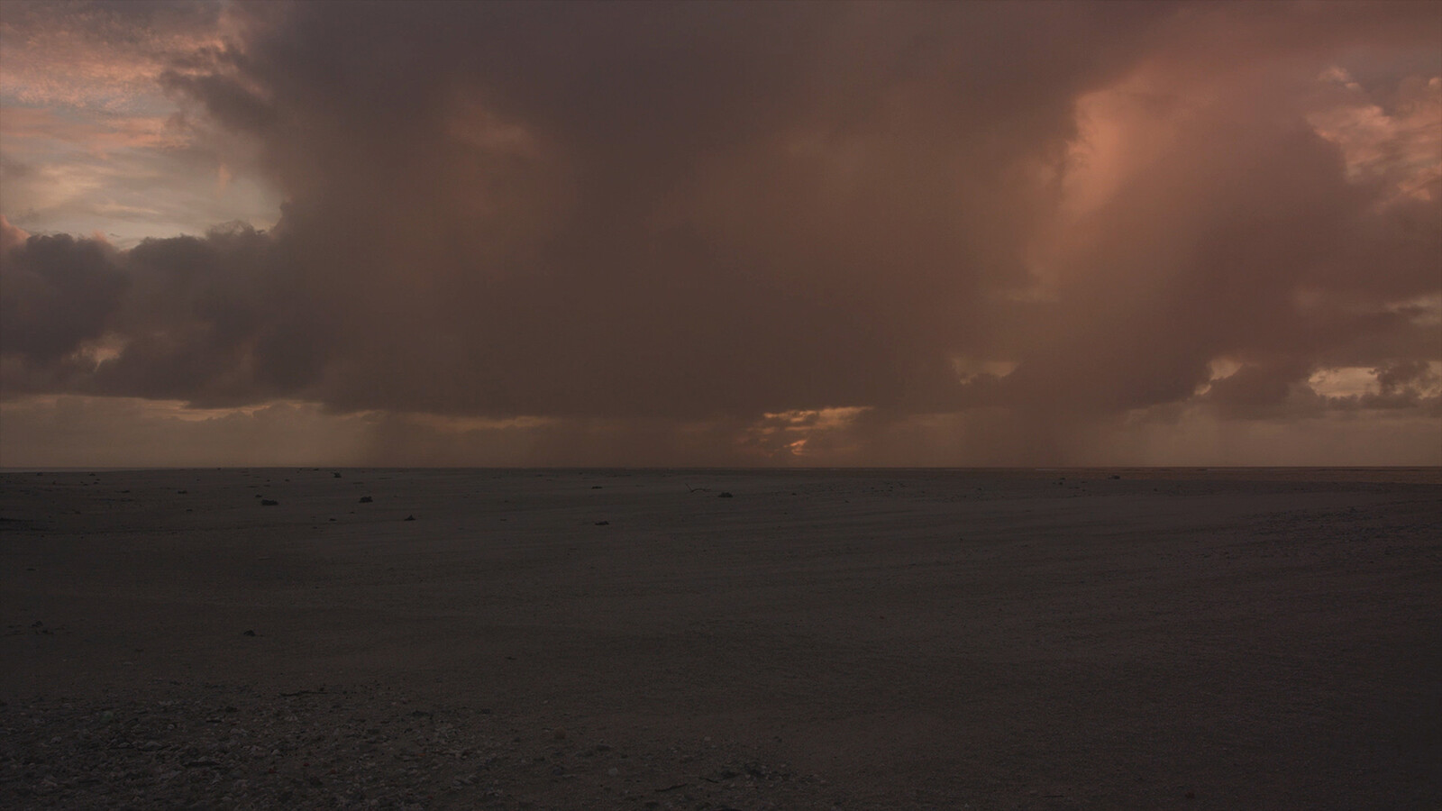 The film work captures the structures’ of the Bikini Atolls’ atomic-industrial architecture decay, its manner of editing further suggesting morphological overlaps with the monstrous wrecks lying on the bottom of the Bikini Atoll lagoon, assailed by tide and time. Making no use of archival material––its original underwater images captured at depths far below standard dive profiles––Iroojrilik is unquestionably the most unique, and comprehensive, perspective on the maritime ruins of Bikini ever put together. Yet, rather than explicating individual vessels or buildings, the cumulative impression given is that of an Atlantis or lost civilization —architectural features of one ship cut together with those of others, such that it appears as though a submerged mega-structure has been discovered. On a more general note, the film employs another series of elisions and substitutions. Through a series of montages, mixing sunsets and sunrises, it proposes an uncertain distinction between daybreak and nigh fall––first light of a new day in Pacific history, and the waning of another. Visions of multiple suns and endless dawns stretch across the horizon. Pictorial energies shift and sway, like palm trees and coral ferns growing on cannon mounts, between construction and destruction, transporting the viewer to a “non-place,” or the beginning of a brave new world.