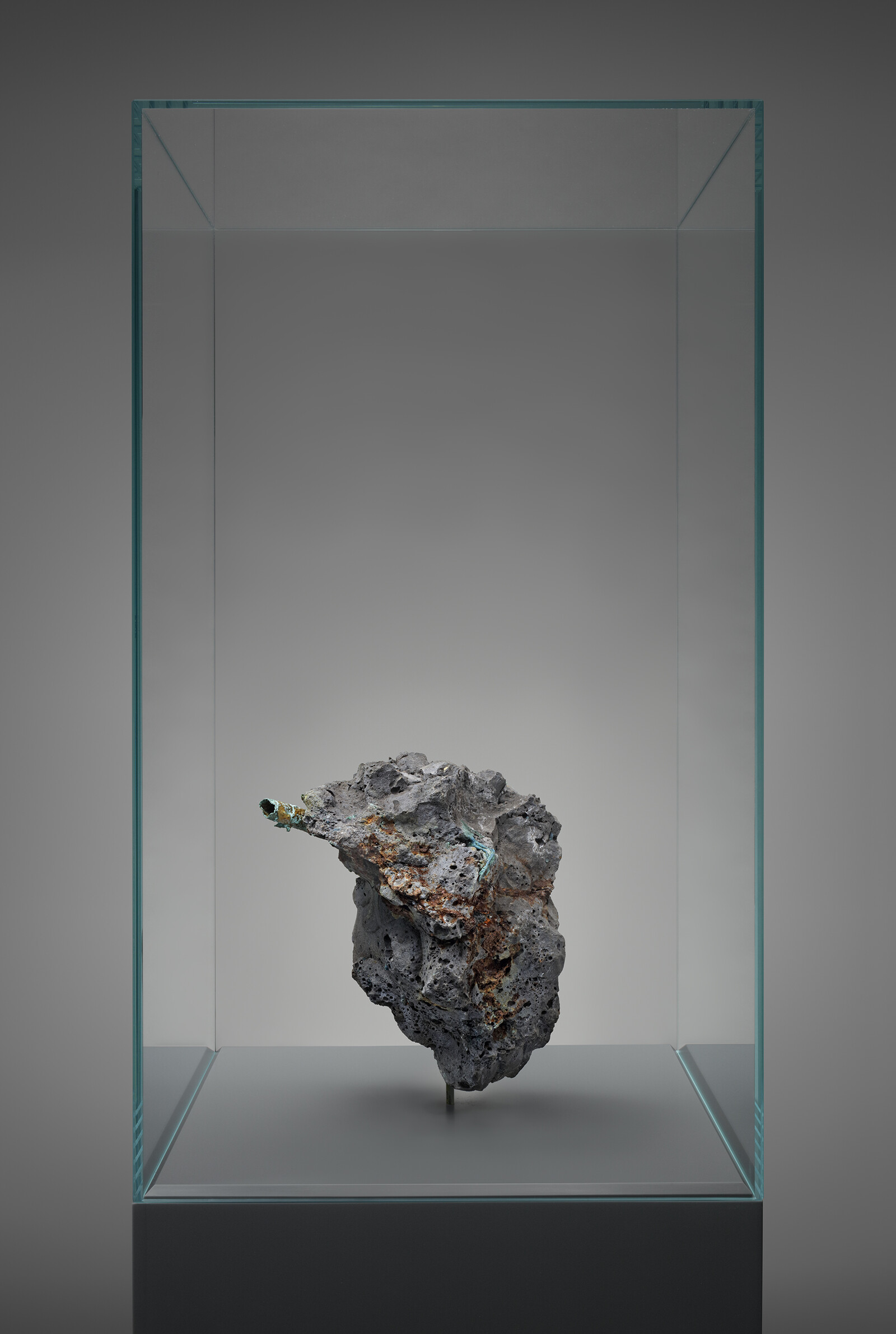 Displayed in vitrines like topological fragments from a futuristic natural history museum, Metamorphism is an amalgam of cultural memories incorporated into a geological matrix. For this piece internal elements from various technological devices (main boards, hard drives, CPUs, RAMs, etc. from laptop computers and smartphones) have been molten in an artificial lava, returning them to their geological origins. Beautiful aesthetic objects in their own right, these magnificent polychromatic sculptures reflect upon the mining and use of raw materials and the future of our civilization’s artificial by-products.