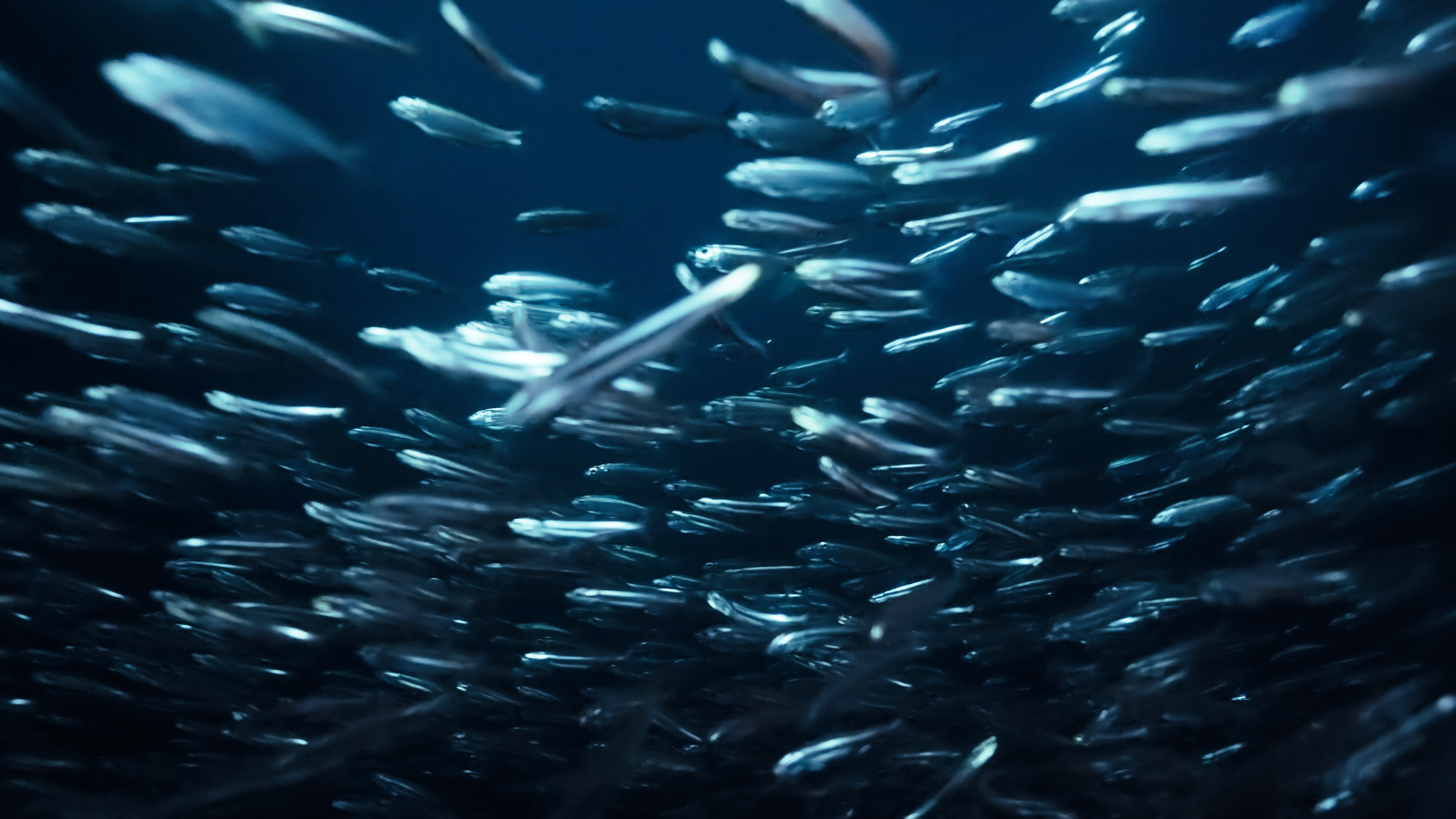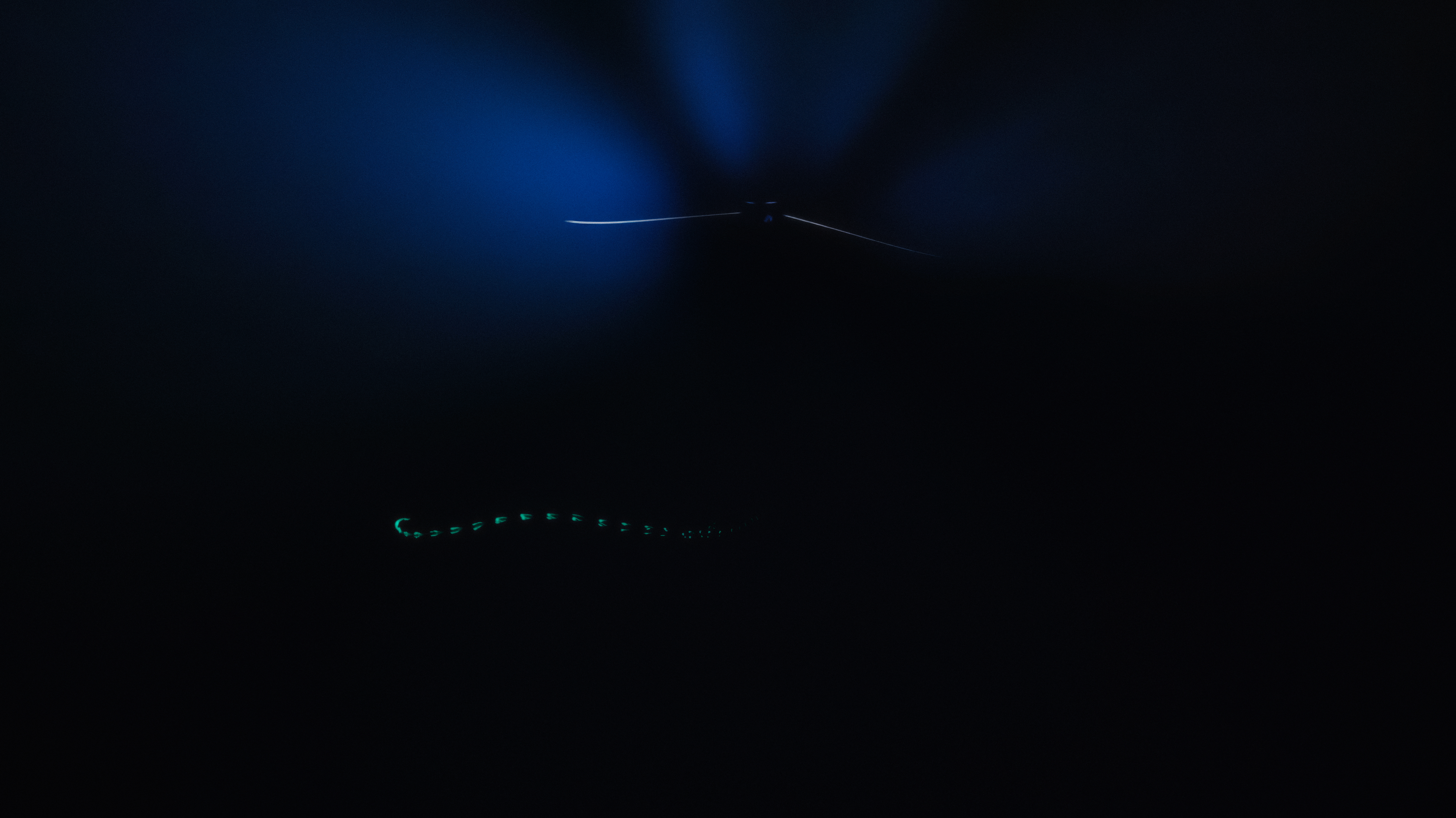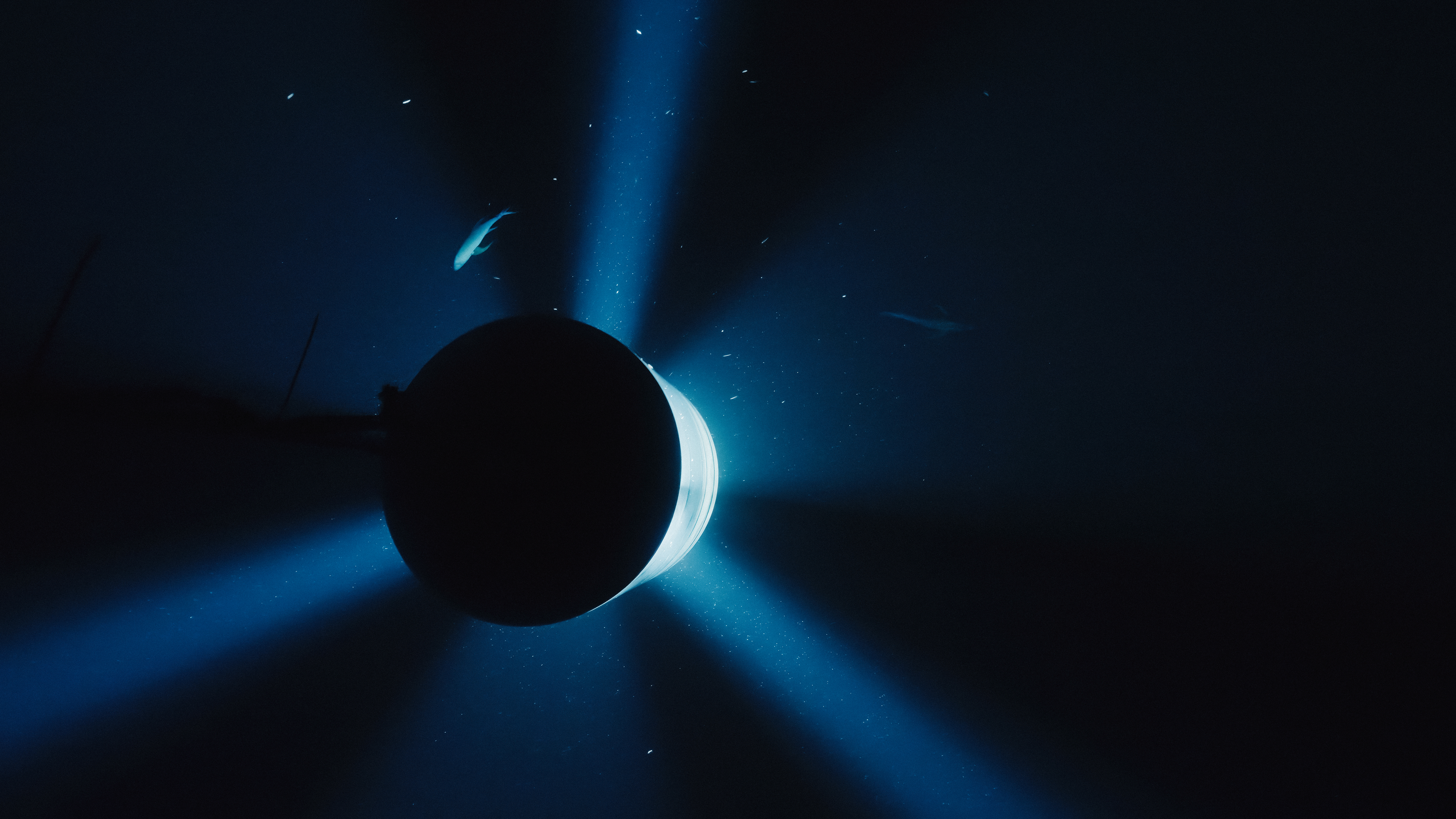 In Midnight Zone, a Fresnel lighthouse lens—a tool to aid navigation—guides the film downward, metre by metre, through teeming schools of fish and sharks: their whirling figures glinting like a thousand fluid mirrors around the light source; so many aquatic moths to a flame. As its powerful light beam spins through the deep, slicing through darkness, the surrounding gyre of swimming creatures becomes a living kaleidoscope. Following the falling lamp’s initial submersion, it attracts more biomass with every passing fathom, until a point of crescendo, after which the giddy swarm slowly thins out. This decrease in the registers of the great depths was achieved by the probe. By the end of the filmic sequence, captured by an underwater drone piloted by the artist, the lamp has arrived at the beginning of an aquatic threshold: a domain otherwise impervious to light, too deep for photons from the sun to penetrate—the so-called ‘midnight zone’.