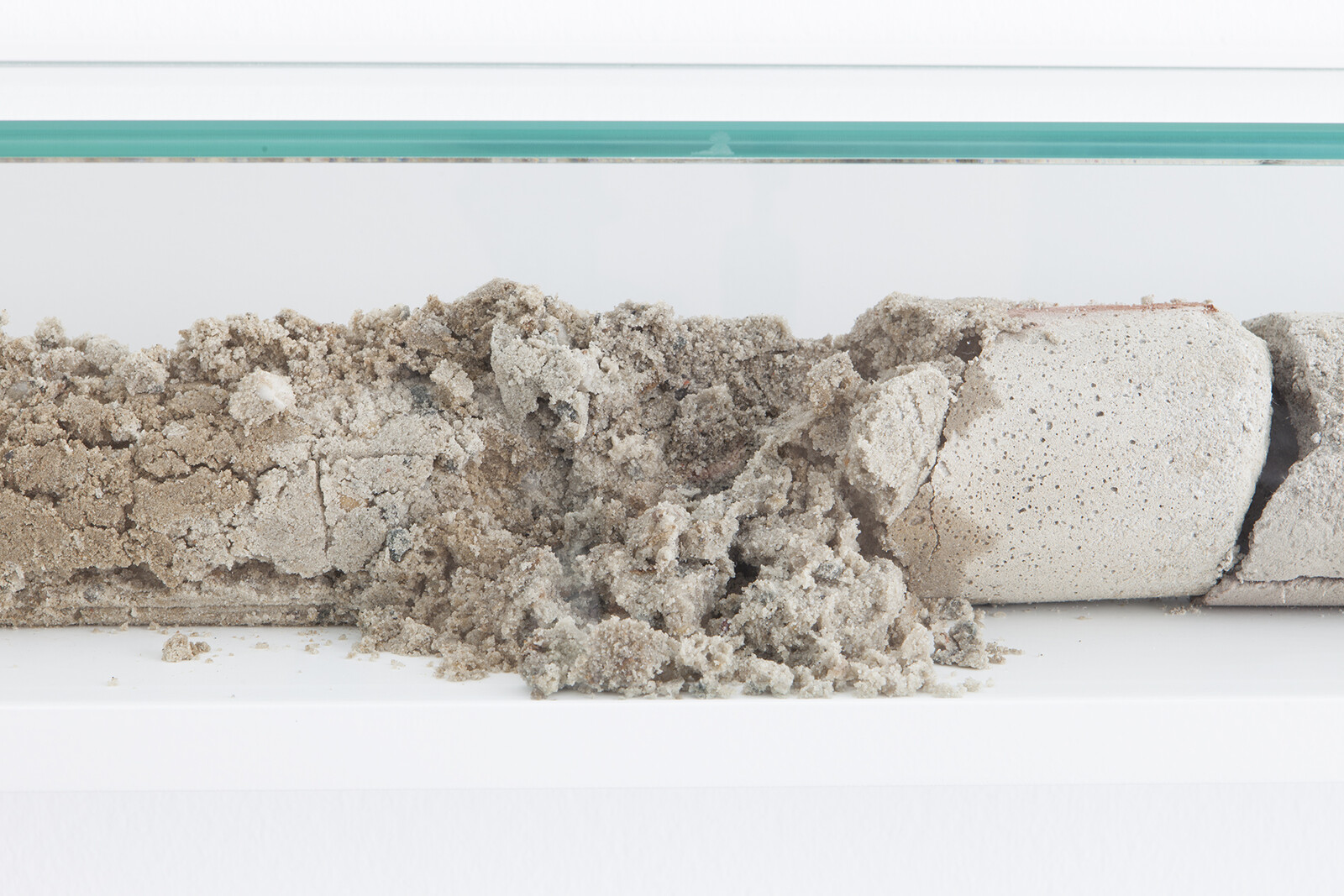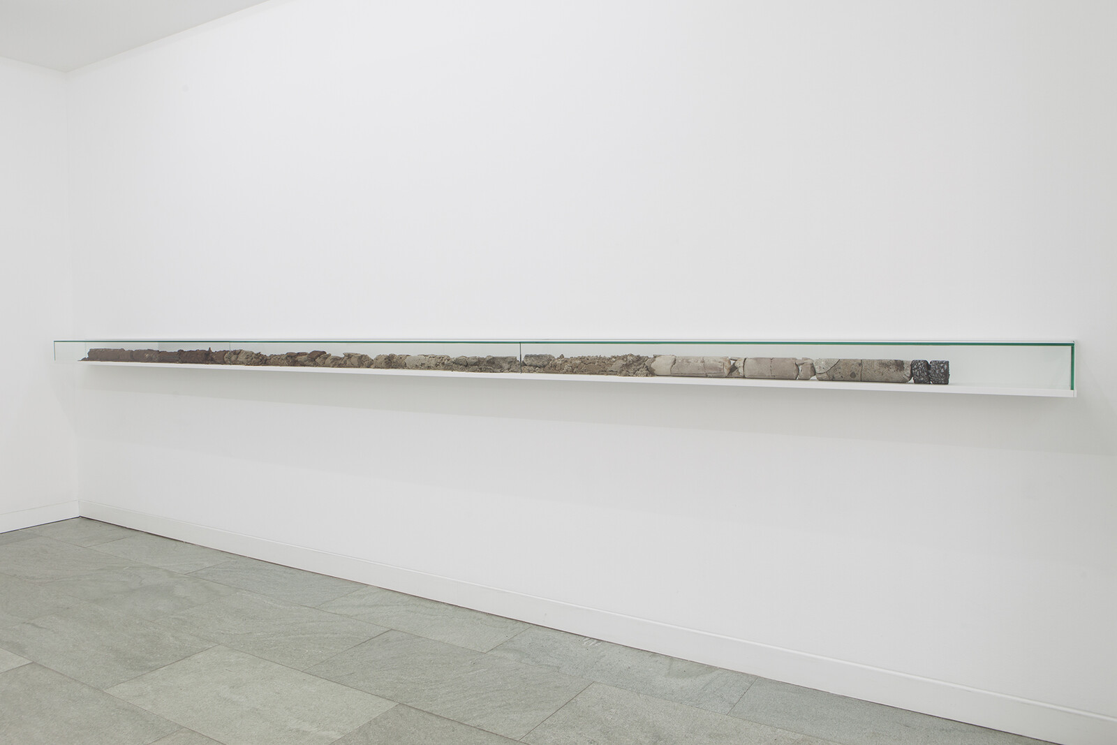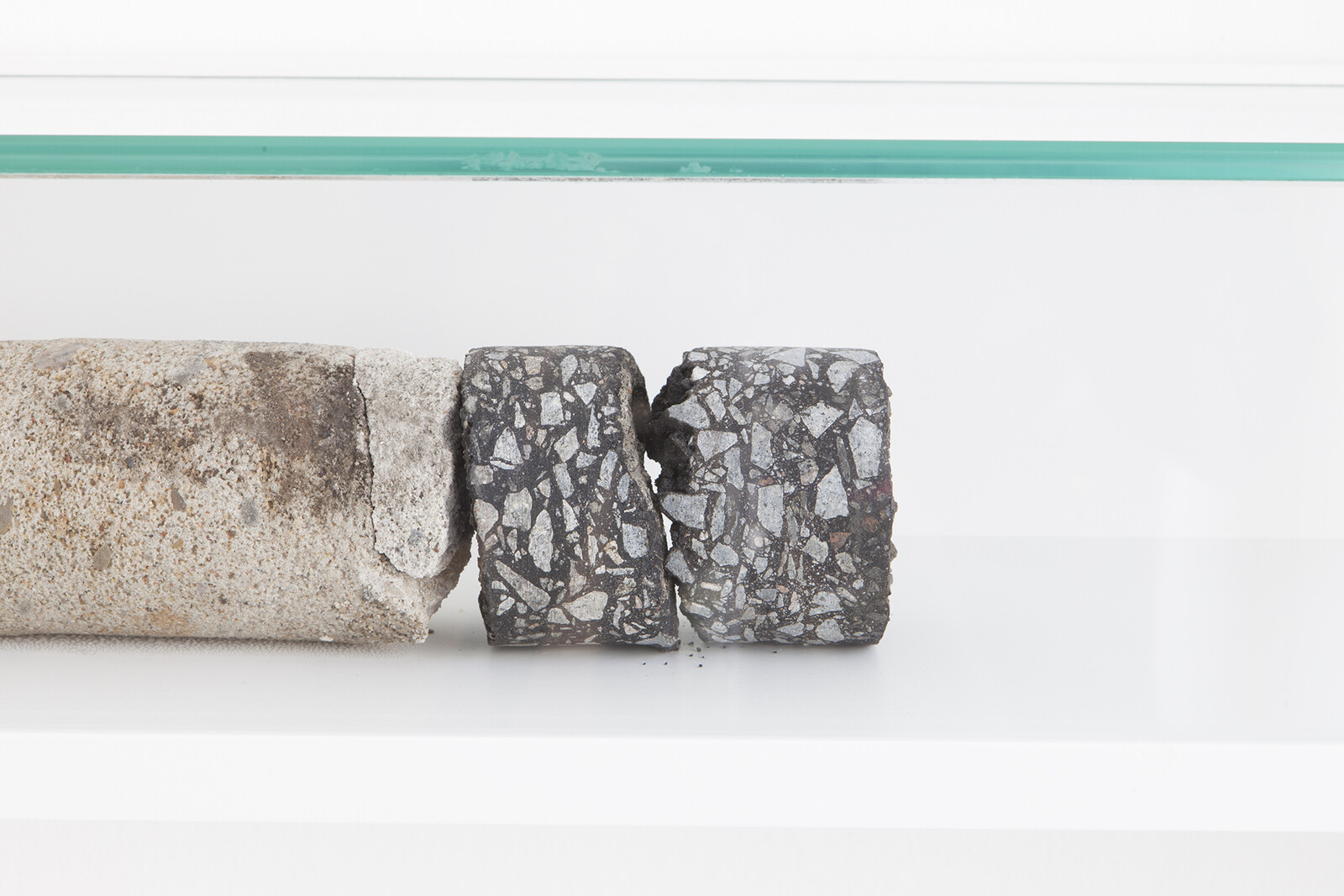 On The Sidewalk is based on the exploration of human consciousness and the time-space relations between objects. Core samples from a range of locations, depths, and time periods––including cores from geological investigations, architectures, modern streets, and old Berlin cobble-stone pavements––were collected for this work. These core samples are then cut longitudinally into four pieces, to be reassembled separately in each sculpture and fastened with stainless steel hose-clamps. With the reassembly of these cores––and thus of the stories and the consecutive presents that they contain––time and space are mixed and compressed to form new arrangements with new dialogues between both geological and architectonical elements. Each sculpture functions as an avatar of a vertical geological timeline, stressing the idea of history as a human construction.