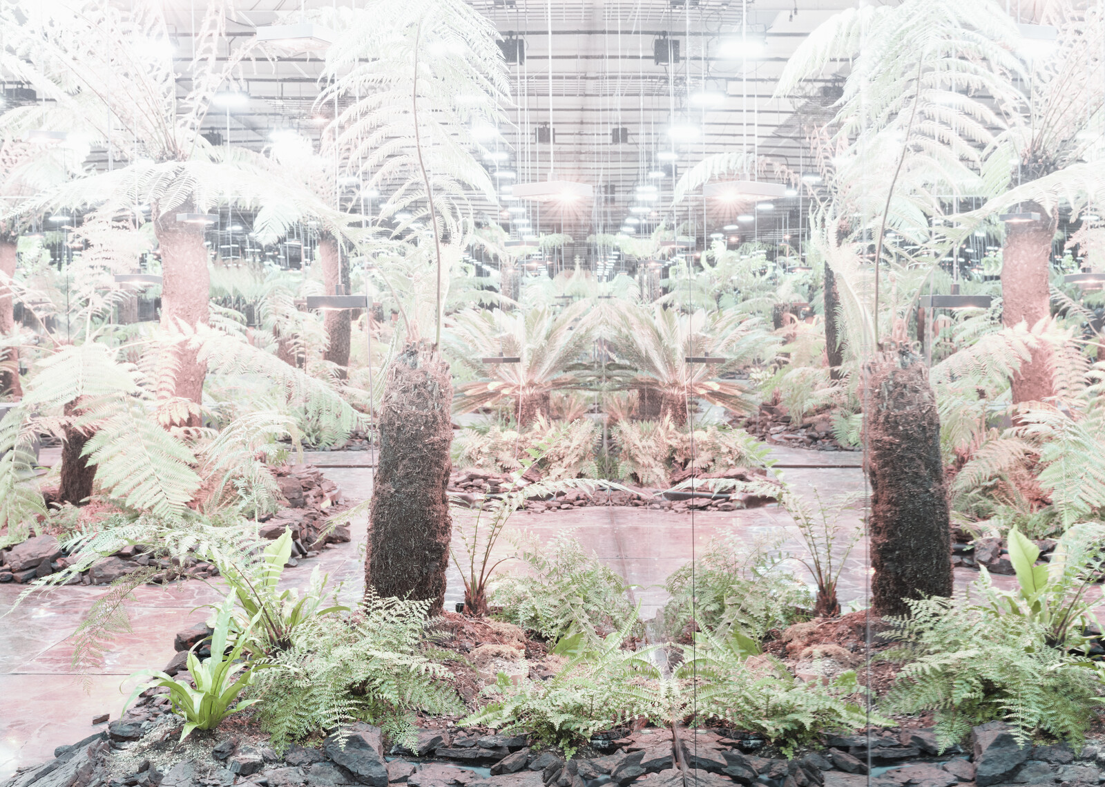 Panchronic Garden walks the visitor back, or perhaps forwards, in time, lapsing occasionally into stroboscopic flashes. Within these bright breakages, the forest is again revealed as green, and mirror walls lapse into infinity: building a cosmic bridge between seed and coal seam.