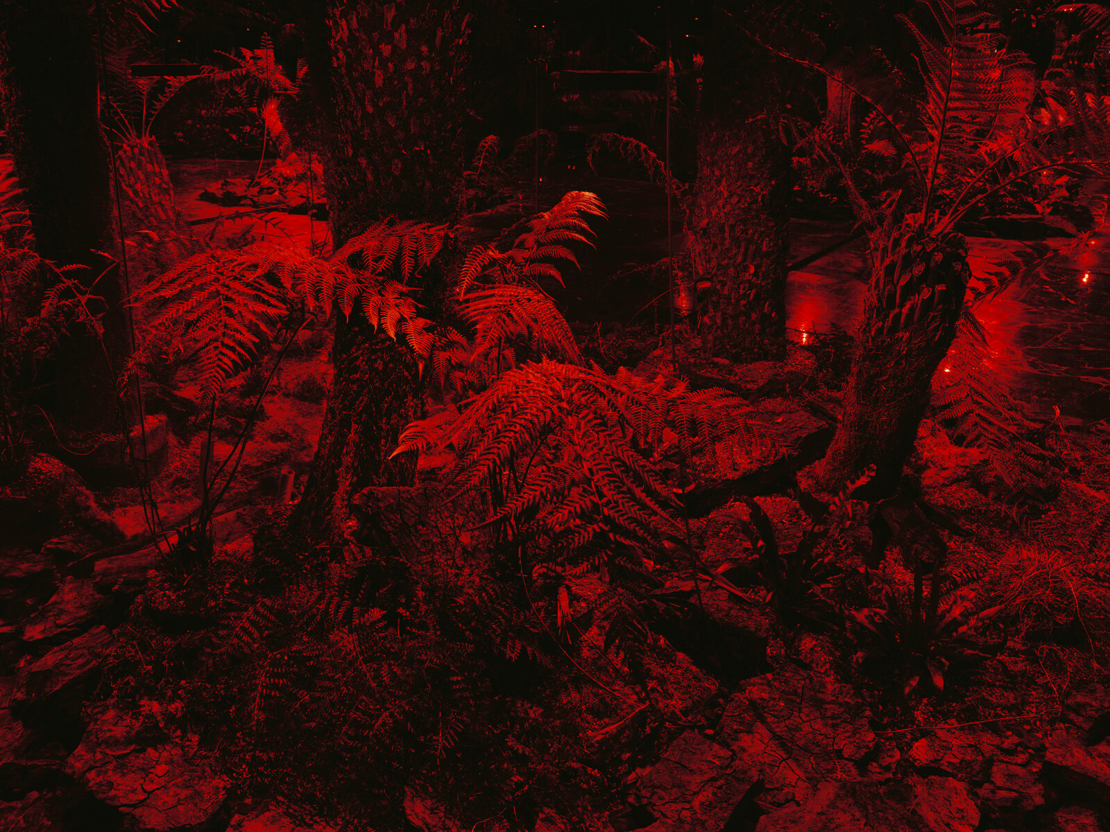 Inside this large-scale immersive installation, the visitor is steeped in darkness, surrounded by vegetation. The vegetal presence is represented by horsetails, ferns, and cycads, along with other species that reach back to the biomes that deep time would transfigure into hydrocarbons. Desaturated by infrared lights, this foliage appears blackened, reverberating in red. Entering this subterranean world, the visitor navigates a floor panelled with anthracite, while crackling sounds appear to rush around them. Produced using specialised contact microphones and sensors, Panchronic Garden sonically relays the umwelt of the greenery it hosts, acknowledging the agency of plants as integral co-producers of life on this planet. It is through their transformation of solar energy into matter that plants have bequeathed altered environs for future generations. In turn, their fossilized sunshine becomes archives of former eras, releasing memories of long-dead habitats when burnt as fuel.
