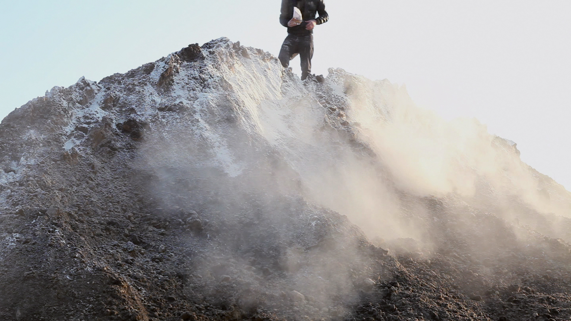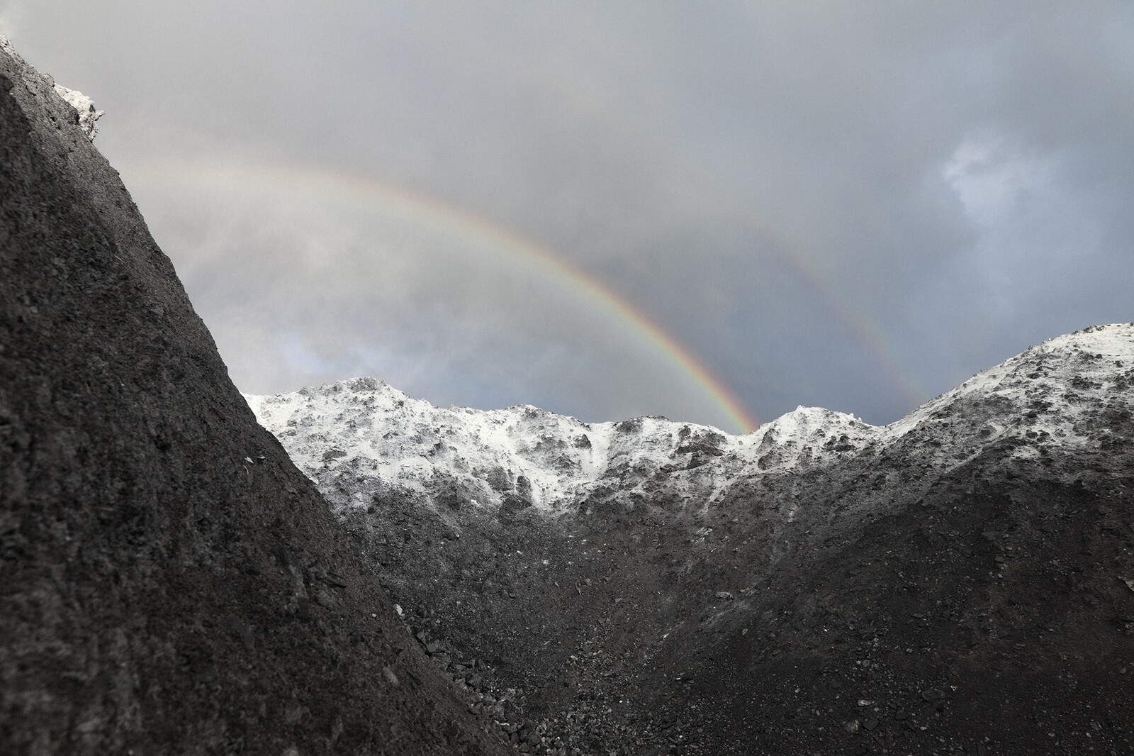 The series Panorama consists of photographs seeming to depict majestic alpine landscapes under various weather conditions, showing snowy peaks emerging from foggy valleys or mountain panoramas lit by a fleeting rainbow. But images are not always what they appear to be and, indeed, what Julian Charrière shot in this series are different ephemeral interventions, produced site-specifically in various construction sites in Berlin. The artist used extracted soil covered by flour and fire extinguisher foam to generate miniature, model Alps inspired by his native Switzerland in the middle of the city. With this work, the artist questions not only how perception works, but also our fantasized relation to “nature” and the sublime, while playing the demiurge on his own, limited scale.