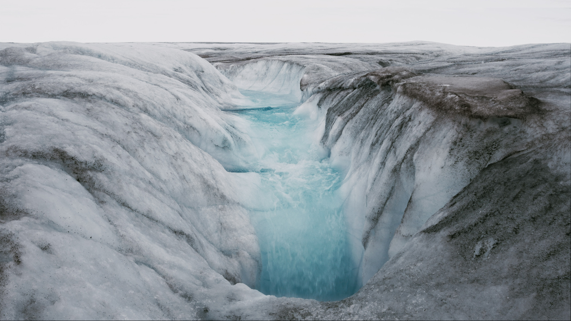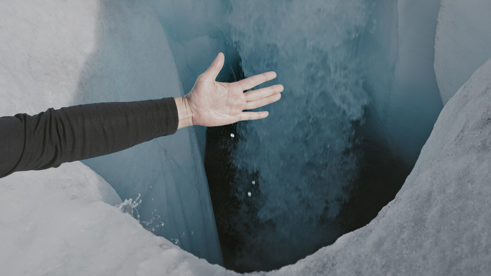 The film Pure Waste was produced by Julian Charrière during a scientific expedition to the polar ice cap. Set in North Greenland, it documents a material reversal that effectively inverts the conventional geological mining process. The artwork begins with several shots that capture the atmospheric quiet of the Arctic. It presents as a serene and desolate vista, until a human hand interrupts the scene. Slowly entering the frame, it opens to reveal five diamonds which are then tossed into a glacier mill.
