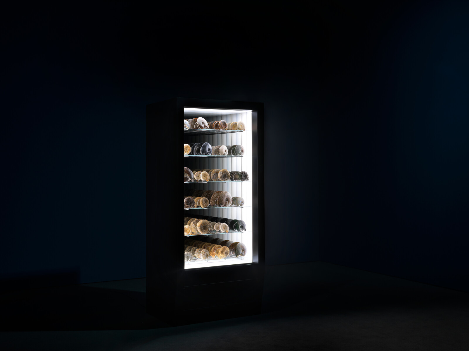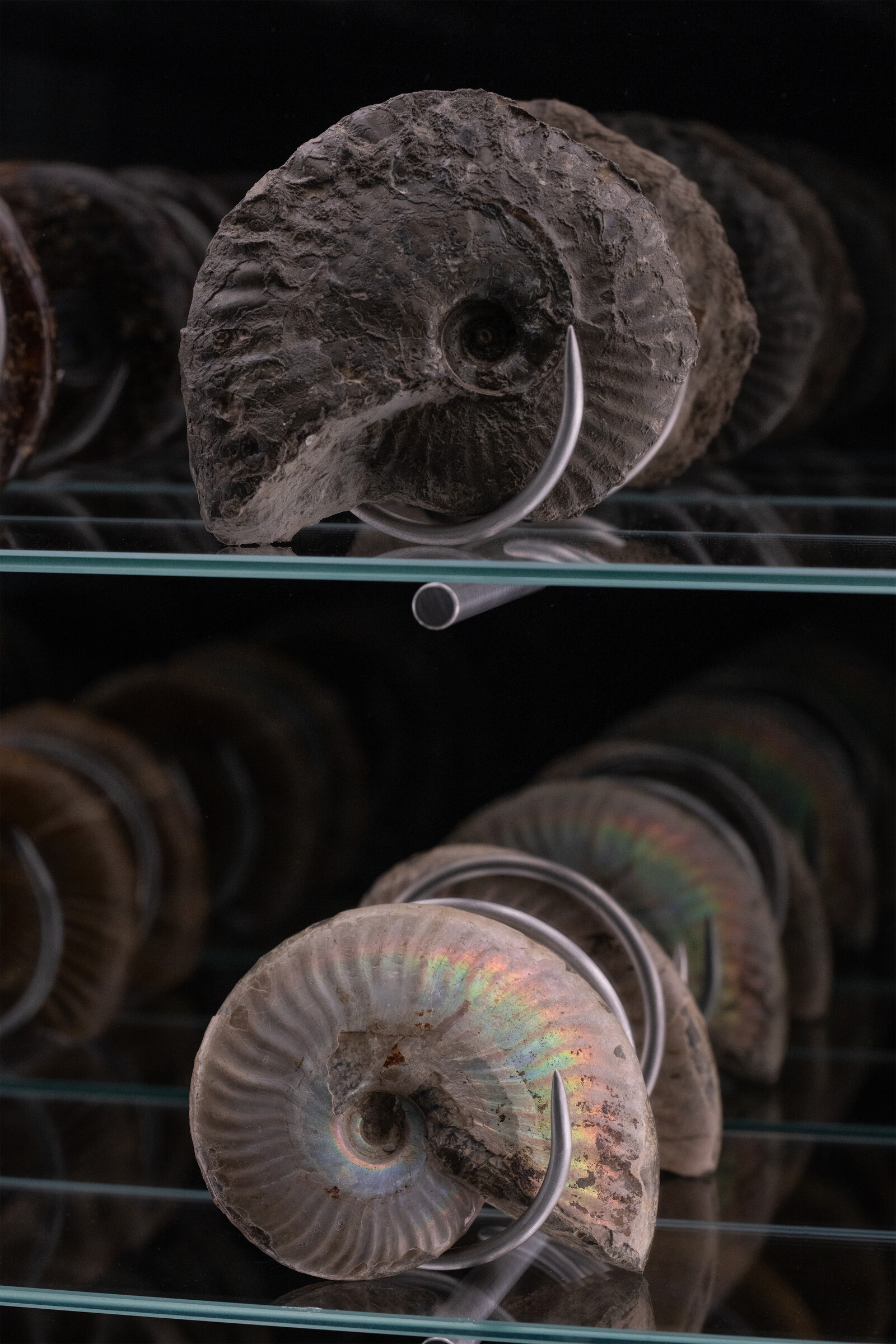 Spiral Economy takes the shape of a vending machine, but instead of snacks, it offers fossilized ammonites: ancient marine beings, coiled into stone over millions of years. Inside, an infinity mirror reflects their spiral forms into a hypnotic loop, reinforcing the illusion of endless supply. This familiar object transforms into a meditation on deep time, extraction, and the false promise of infinite resources.