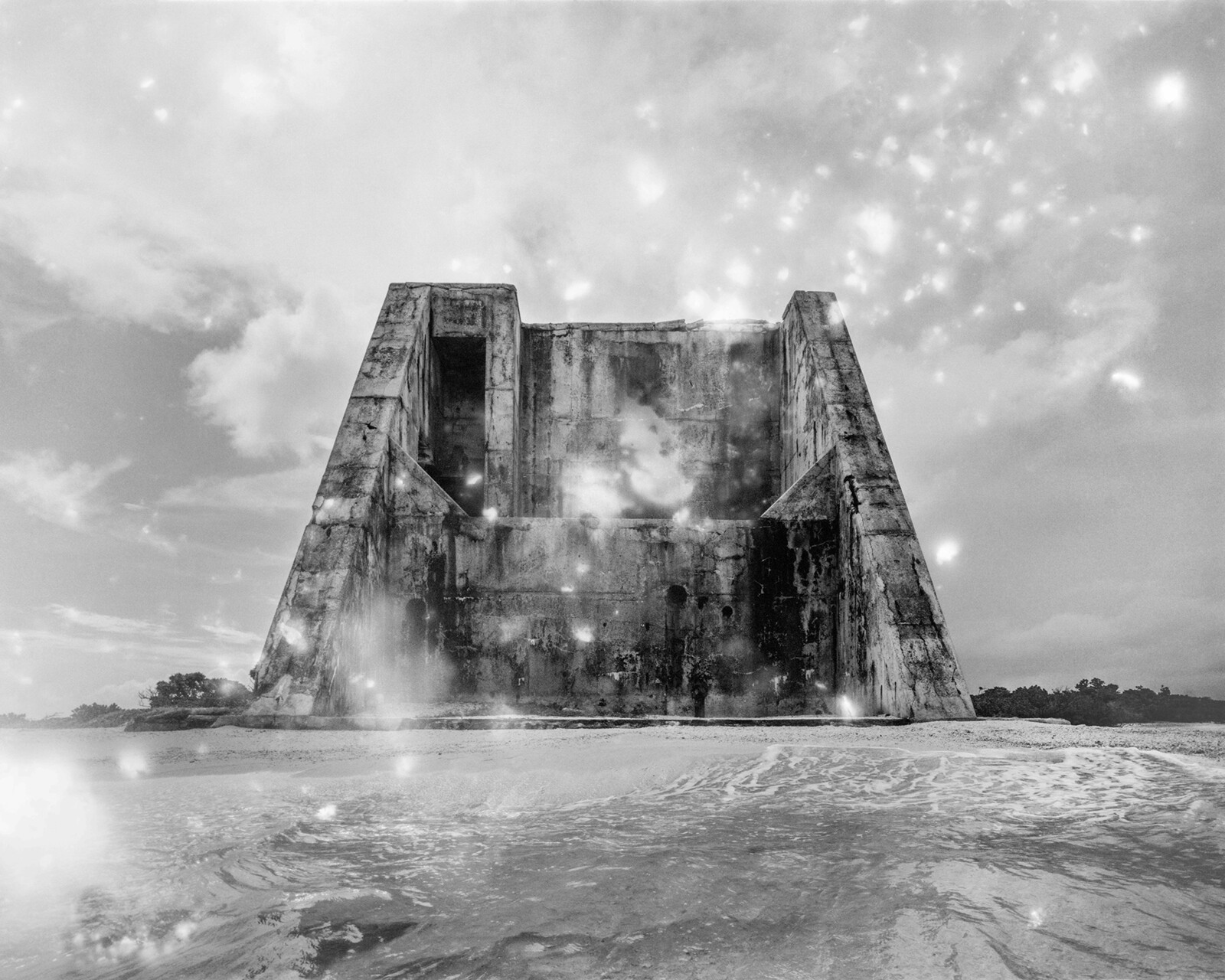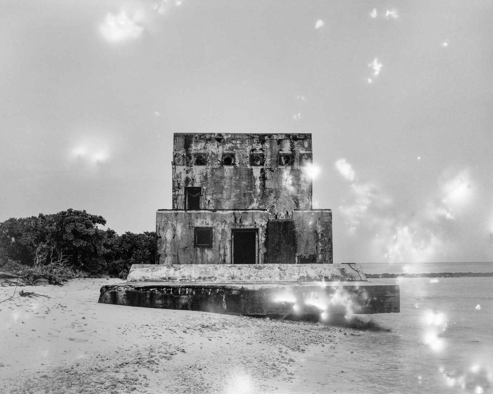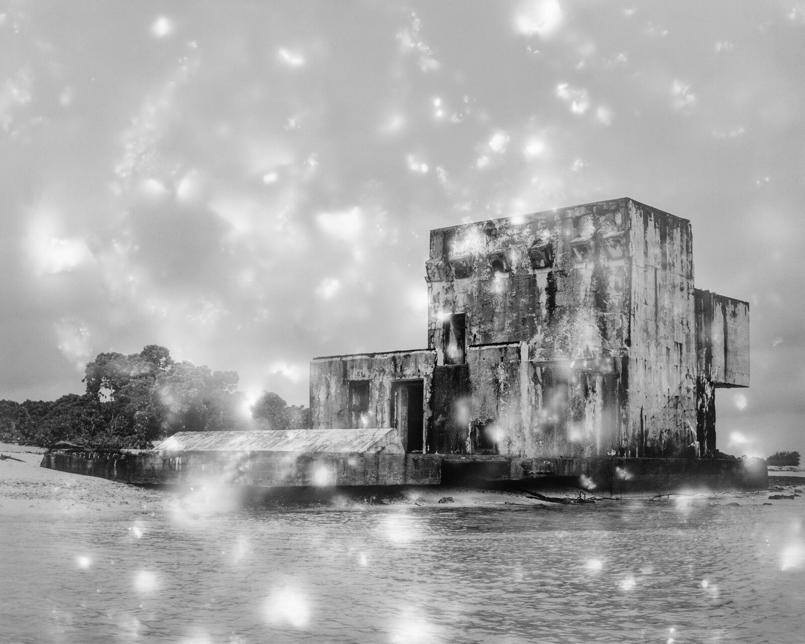 Like Charrière's series Polygon, these black and white works recall the objective style of the Dusseldorf School while surveying the apotheosis of mid-century atomic-industrial architecture. With their rusting iron rebar and crumbling concrete, now falling like flakes – prey to salt air and, once, unimaginable vibrations - some of these structures recall pyramids; odious leftovers of a questionable ideal.Aomen II - Terminal Beach, 2016