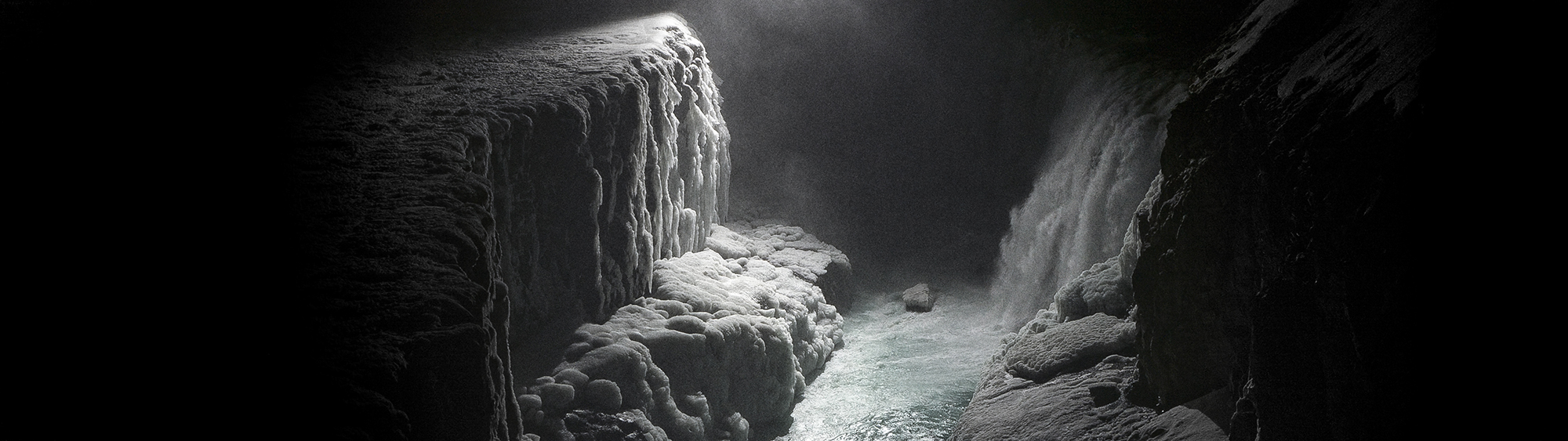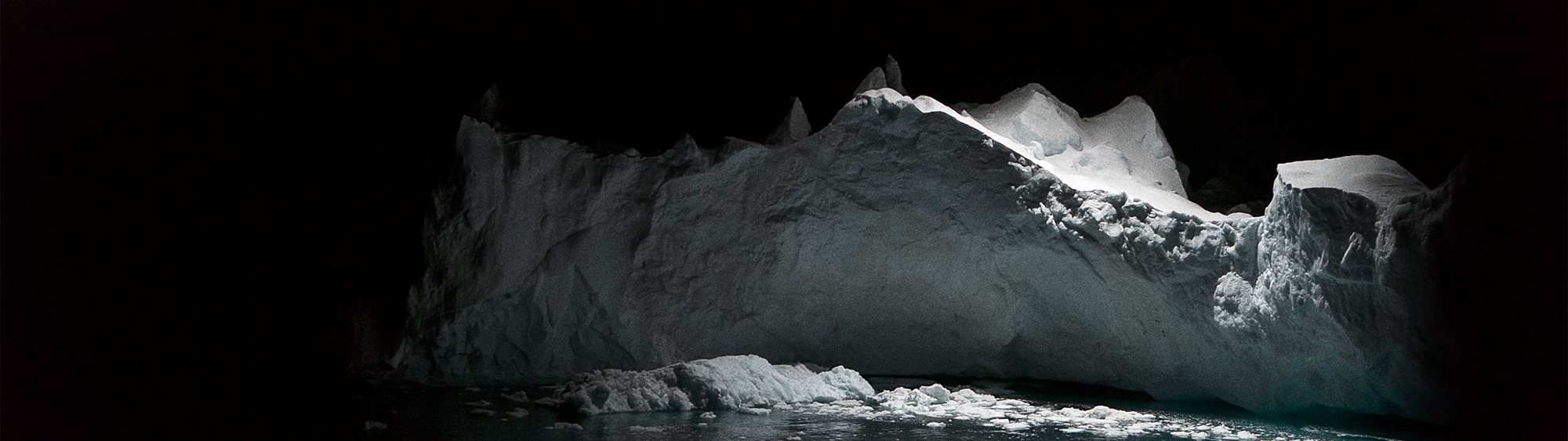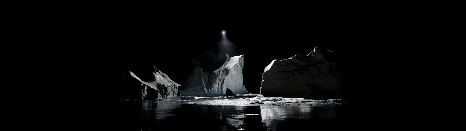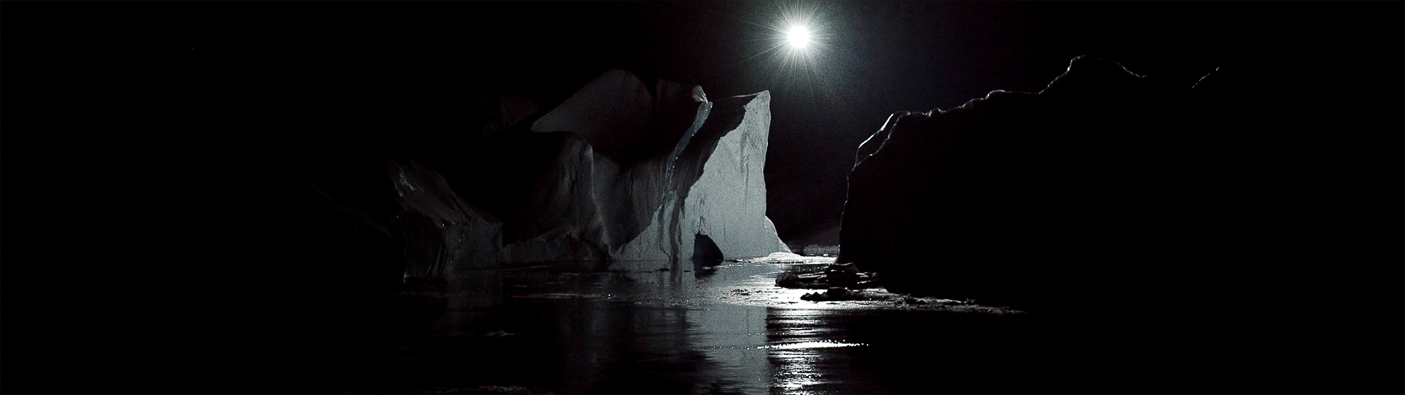 Along with his Berlin-based team, he developed customized technological equipment, including drones carrying spotlights and cameras. The video footage for the film was recorded at night, contrary to the romantic image of a dazzling landscape of white snow and bright daylight that we generally see pictured. A spotlight carried by a drone reveals the massive landscape in snippets, limiting the range of vision and heightening its drama by the deep shadows the icebergs cast. Eerie sounds of cracking ice and water flowing remind us that this frozen landscape is very much alive, breathing, moving and constantly evolving. All of these elements combined underline an otherworldly presence and a scenario in which one begins to lose all sense of grounding or scale, highlighting that the western man’s limited experience and, at times, falsely constructed perception of the polar regions is both reinforced and challenged.