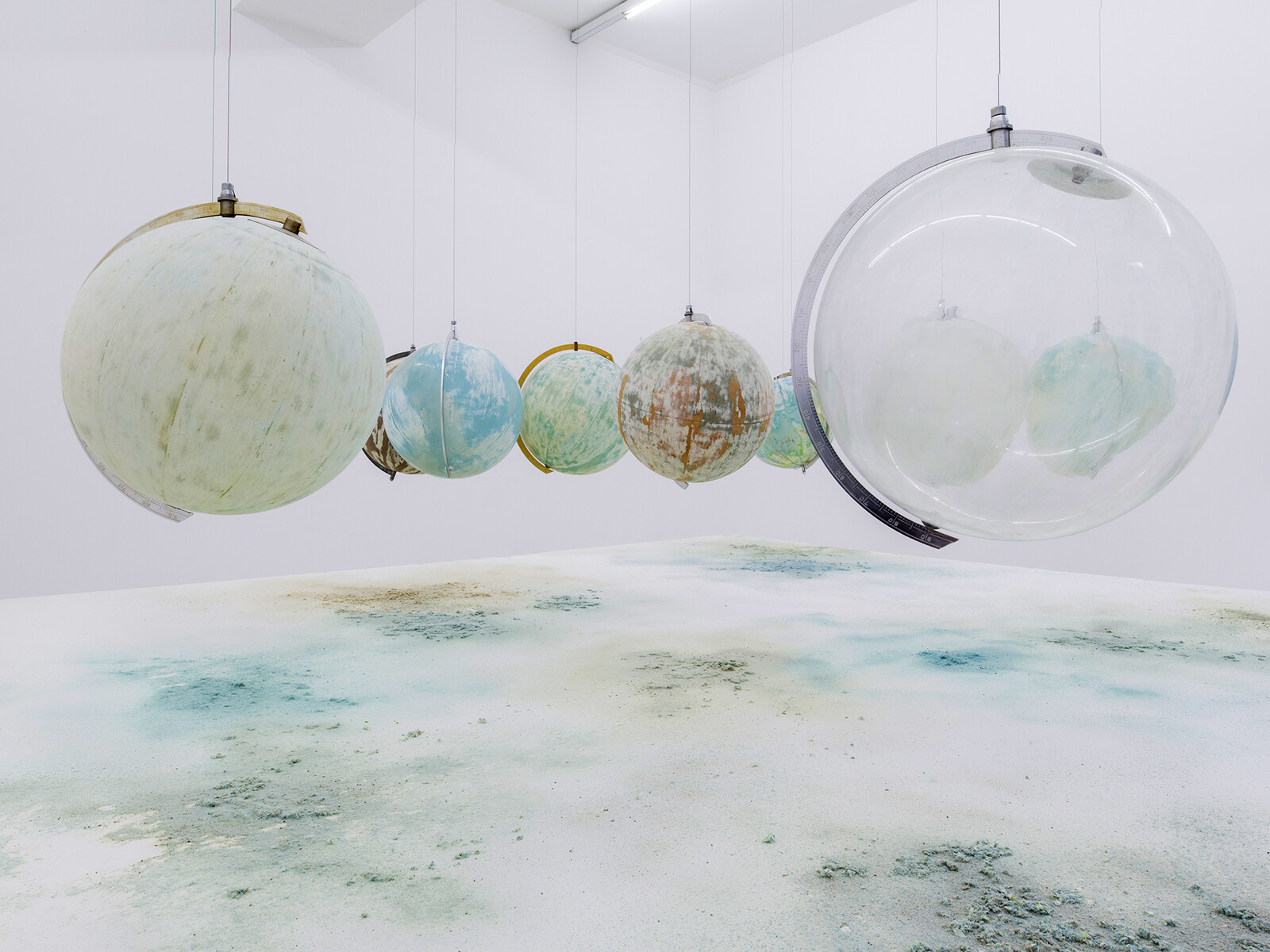 We Are All Astronauts, whose title is inspired by the writing of Buckminster Fuller, is composed of world globes stripped clean of their geographic information. Dating from 1890 to 2011, the artist has sanded away the globes’ varying successive and shifting geopolitical contours using “international sandpaper” created with mineral samples from all U.N. recognized countries, which the artist originally created in his previous works, Monument – Sedimentation Of Floating Worlds (2013). Dust created by the abrasion gently settles beneath the globes, creating new, yet-to-be-defined cartographies. The globes are rendered as useless as their carefully drawn territories in an increasingly globalized world bound less and less by borders.