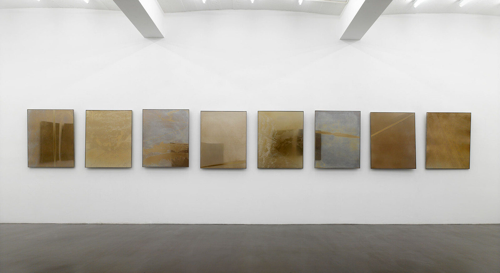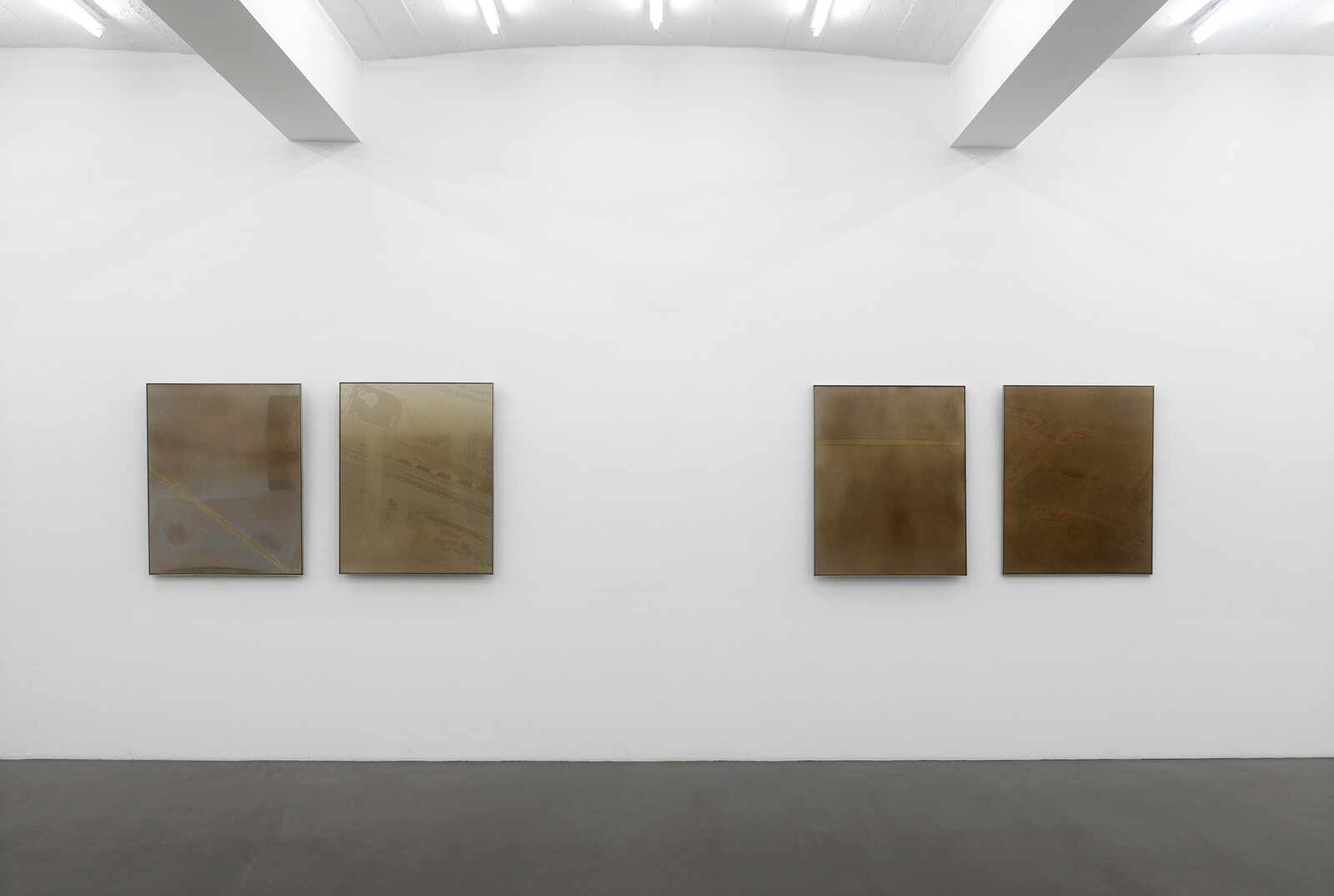 This series of photographic works by Julian Charrière employs the medium’s oldest technique first developed by French inventor Nicéphore Niépce in 1822. Using bitumen collected from the oil fields in Fort McMurray, Canada, a light-sensitive emulsion has been created to process images taken at the oil fields onto polished stainless-steel plates. Each piece is a diptych of one aerial shot and one long exposure to the late summer, Canadian light by way of Camera Obscura. Numbers featured in the title correspond to the geographic coordinates where the photographs were taken. The series stands as a conceptual mise en abyme: a view of and from the flow of hydrocarbons, addressing their impact on our modern powers of visualization through a return to material sources.