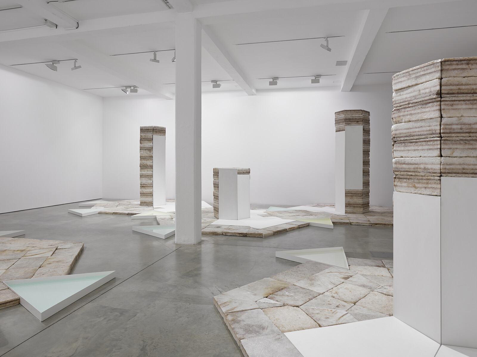 Among the several installations exhibited at Parasol unit is Future Fossil Spaces, 2014, a large configuration of thick salt bricks extracted from the Salar de Uyuni salt deposits in Bolivia, South America, a region now commonly referred to as the ‘lithium triangle’. The chemical element lithium is an essential part of the batteries that power our electronic devices. The film Somewhere, 2014, and the photographic series Polygon, 2015, document the devastation caused by human activity in Semipalatinsk, the site in Kazakhstan where, between 1949 and 1989, the Soviet Union conducted 456 nuclear tests. Charrière’s investigations for Polygon were prompted by J.G. Ballard’s short story, The Terminal Beach.