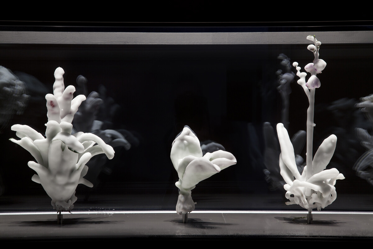 Rather than a hypothetical continent, Julian Charrière lays out a fictitious topography, a sort of “energetic garden”, in the exhibition. On the ground, there are strangely beautiful coloured landscapes made from enamel- led steel containers full of saline solutions from lithium deposits in Chile, which resemble an aerial view of the deposits; rising high, columns of salt bricks from the same area highlight the tension between a material of the future – lithium – and the time which has had to elapse in order to create it; further on time seems to be frozen in a display cabinet where the artist has deposited plants captured in a sheath of ice; finally, a video filmed in Kazakhstan, at the Semipalatinsk nuclear test site, closes – or opens – the exhibition on the issue of the interdependence between humans and their environment. Entitled Somewhere, the video explores the site of the first Soviet military nuclear tests, where the radiation which was re- leased between 1949 and 1989 remains extremely high today. The desolate and timeless aspect of these landscapes, filmed in a slow motion tracking shot by the artist without any accompanying commentary, lends an unsettling strangeness to them. The past catches up with the future in a constantly expanding present.