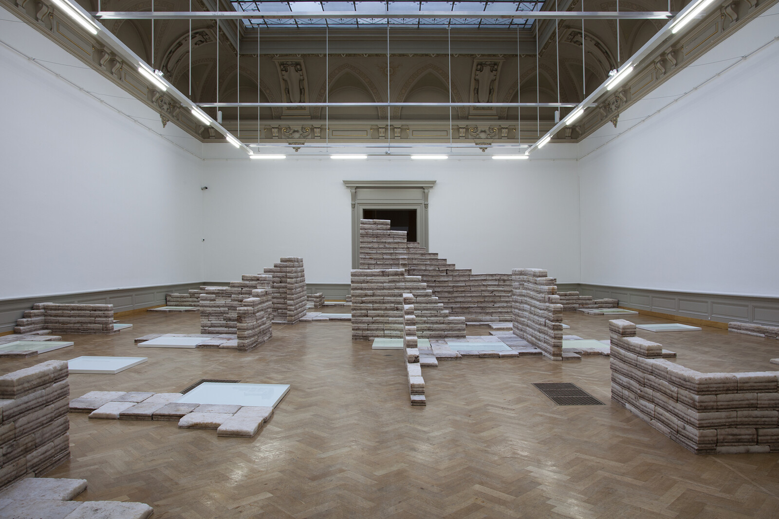 One of the works, the most understated in the exhibition, is entitled The Key to the Present Lies in the Future (2014). Twenty-four hourglasses containing sand from twenty-four geological periods are hurled by the artist against a wall of the Museum. All that is left of all those eras suddenly brought together in the same place and at the same time as a result of a powerful act are glass debris and sandy remnants. The hourglass itself is already a perfect metonymy of the link between time and space since it allows an interval of time to be measured by the movement of matter. The work echoes that of Robert Smithson, and in particular his thoughts on the issue of non-sites, and recalls one of his works in particular, Hypothetical Continent (Map of Broken Glass: Atlantis), created in 1969, a pile of glass fragments which make up the fictitious map of a lost continent.