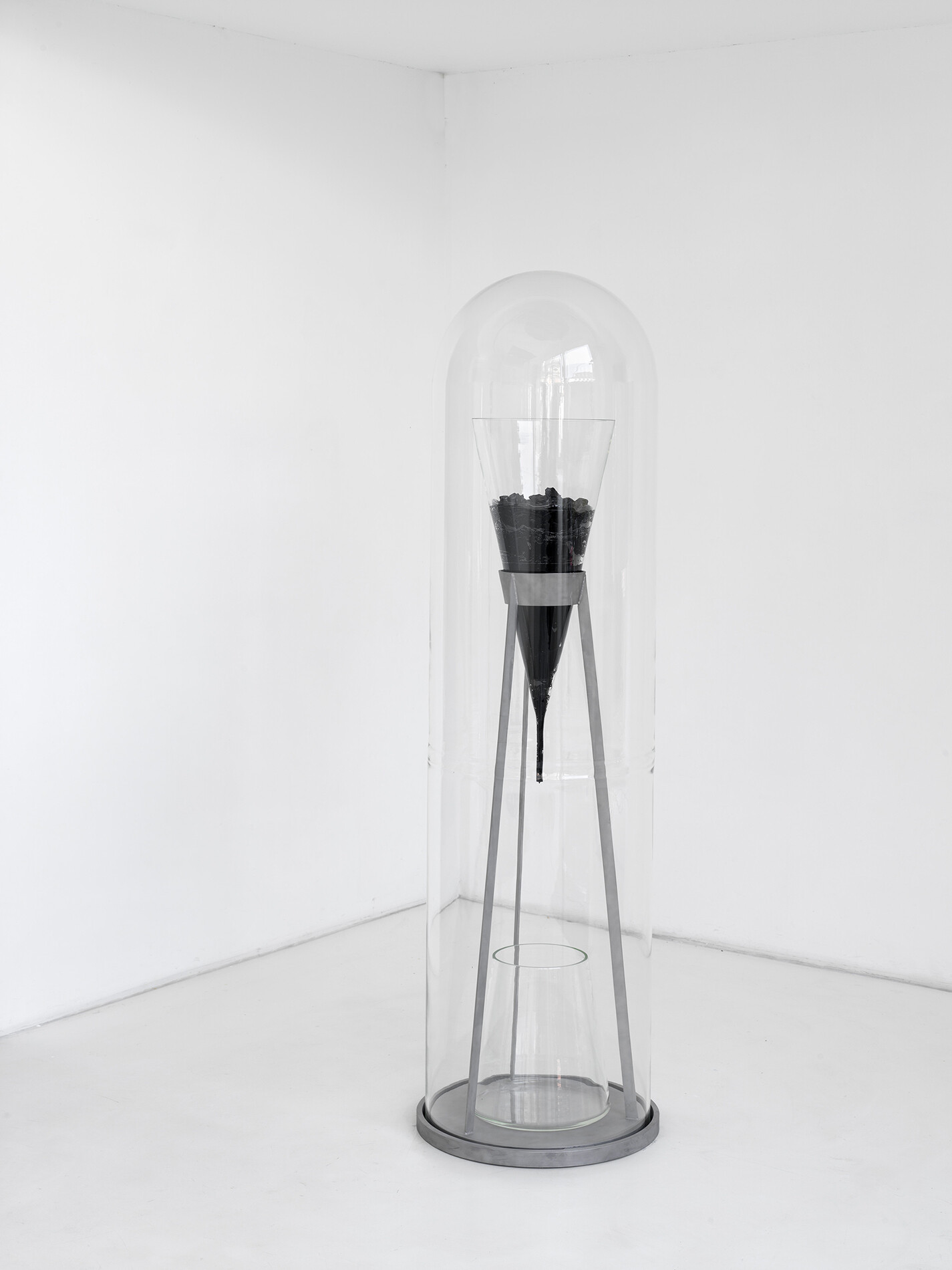 The oldest ongoing experiment in the history of science began in 1930, in a laboratory in Queensland, Australia. The Pitch Drop Experiment records the fluid dynamics of tar, a petroleum by-product that is – to everyday observation – solid and rocklike, but which – over the course of decades – behaves like a fluid. Appropriating the technical format of this slow-motion theatre, Julian Charrière’s performing-sculpture changes and drips, once every decade or so. It is a time- based artwork that – conceivably – plays out at the rate of centuries, beyond the individual human lifespan. It gestures towards a geological timeframe and, as such, invites an aesthetic toggling away from the here and now. That the work’s key media is the same substance that paves our roads, that burns in engines and coats our lungs, is no mere coincidence. If hydrocarbons are the basis of liquid modernity, they are also the prime accelerant of the Anthropocene – the unfolding biophysical disaster that may yet engulf humanity.