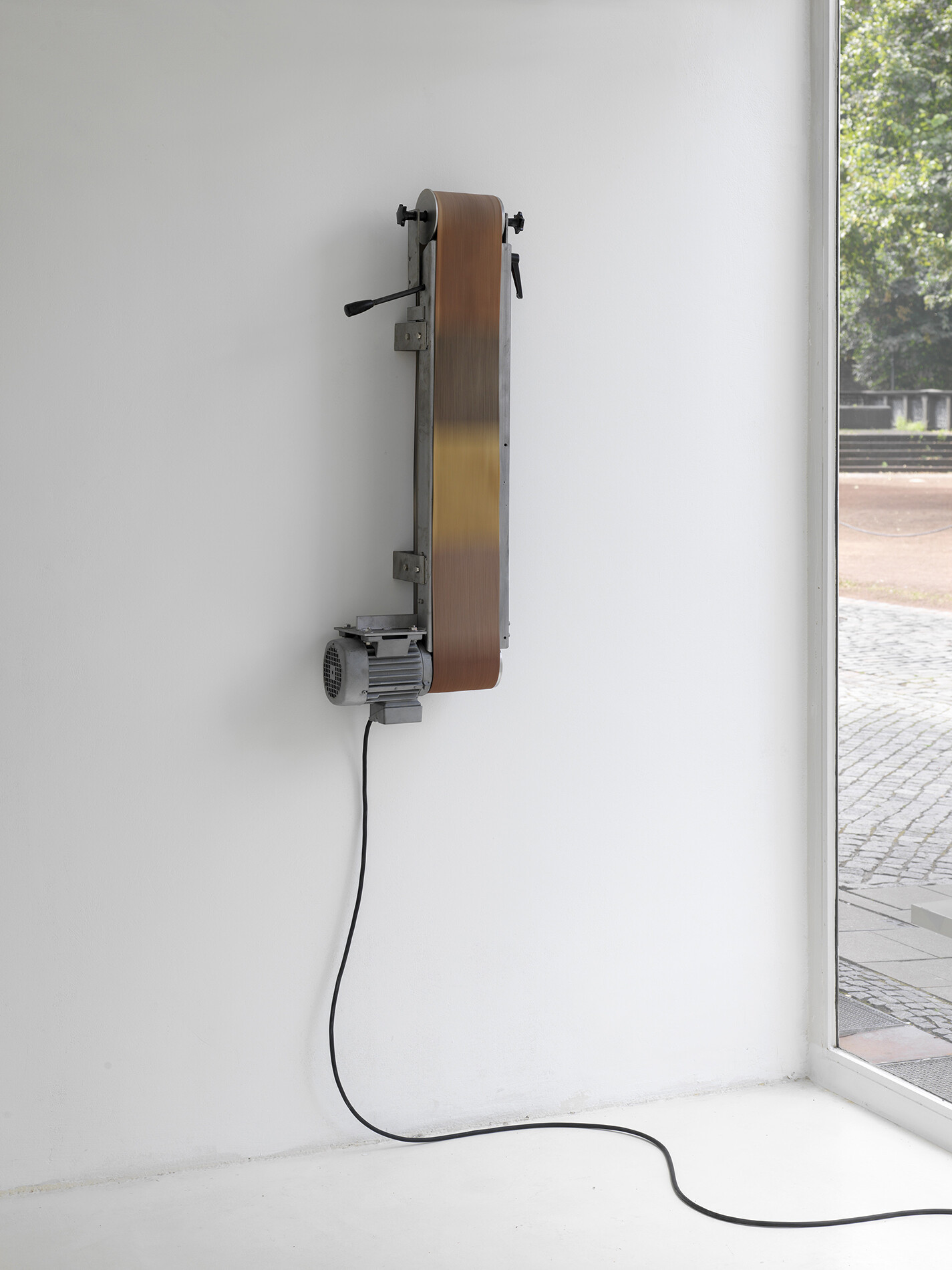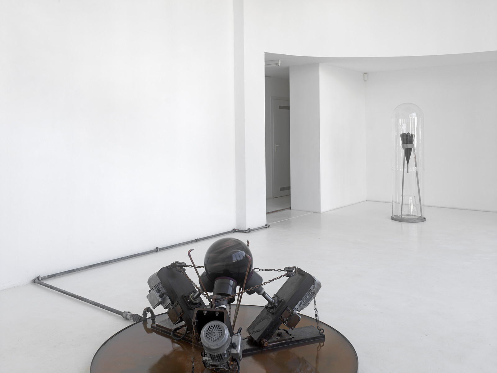 Charrière’s borrowings from the outer reaches of the empirical-temporal field, to displace the high frequency aesthetics of speed/acceleration with the bass hum of deep time, were first manifest in his early work with core samples. One of his newest sculptural pieces, features a large lump of the oldest rock in the world – extant some 4 billion years; 3 billion before the advent of multicellular life – being ground into a sphere by a juddering machine grinder. In this violent mechanical operation one recognizes a stark image for industrialization’s morbid embrace of the globe. But the work also foregrounds a distant past, before mankind. As a conceptual gesture, this sculpture-as-arche-fossil complements Pitch Drop’s nod to times long after the moment of viewing – and perhaps after humanity. Between these two sculptures the artist plots the broadest contemporary wavelength imaginable.