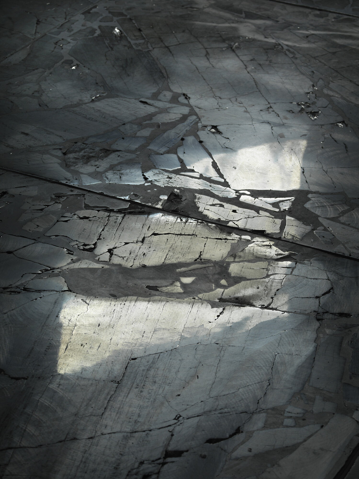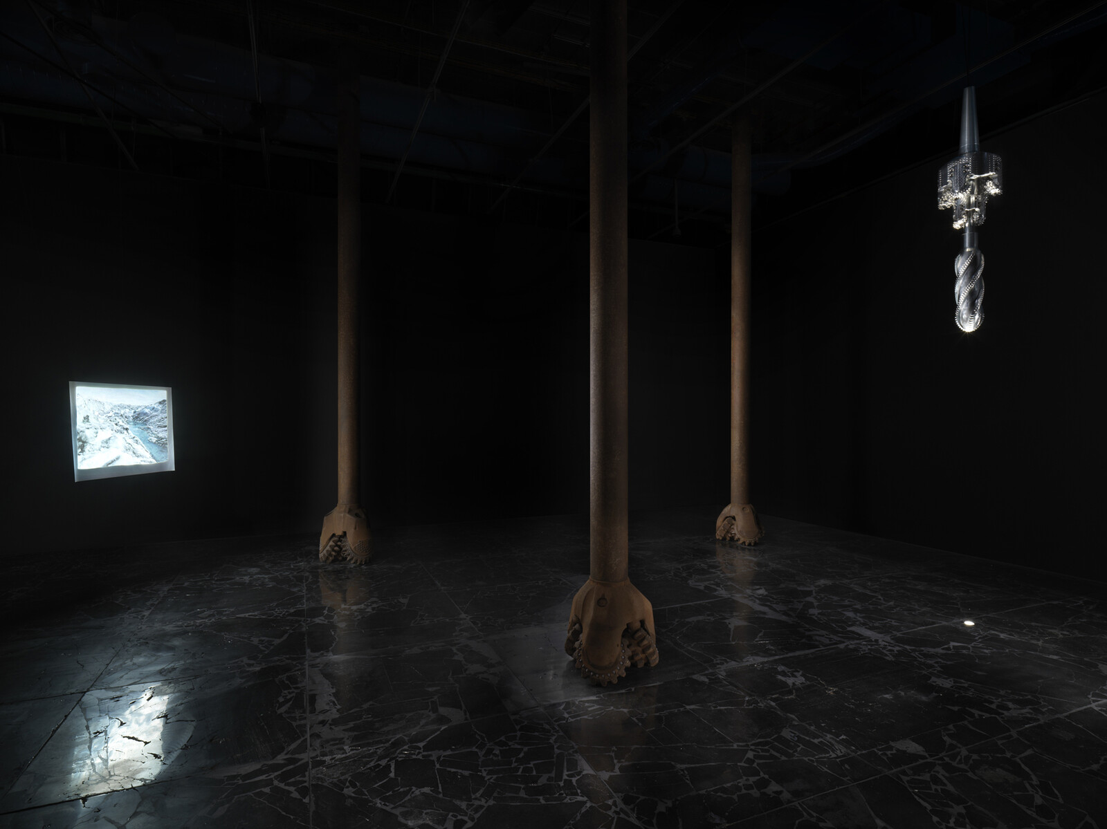 Thus the installation is silent. The floor, a black mirror of polished coal, reflects the ceiling above, emphasizing the intercourse between ground and sky. Oil well drills and their bits, which have penetrated earth’s surface and passed through geological strata and time, stand in the room like ancient columns. One hangs above us, swordlike, its drillbit tipped with the sky diamonds that Charrière has created. And yet the installation is neither temple nor mortuary, but rather a floating space that amplifies the disorientation of the human position not simply on Earth, but also beneath the sky and in an atmosphere.