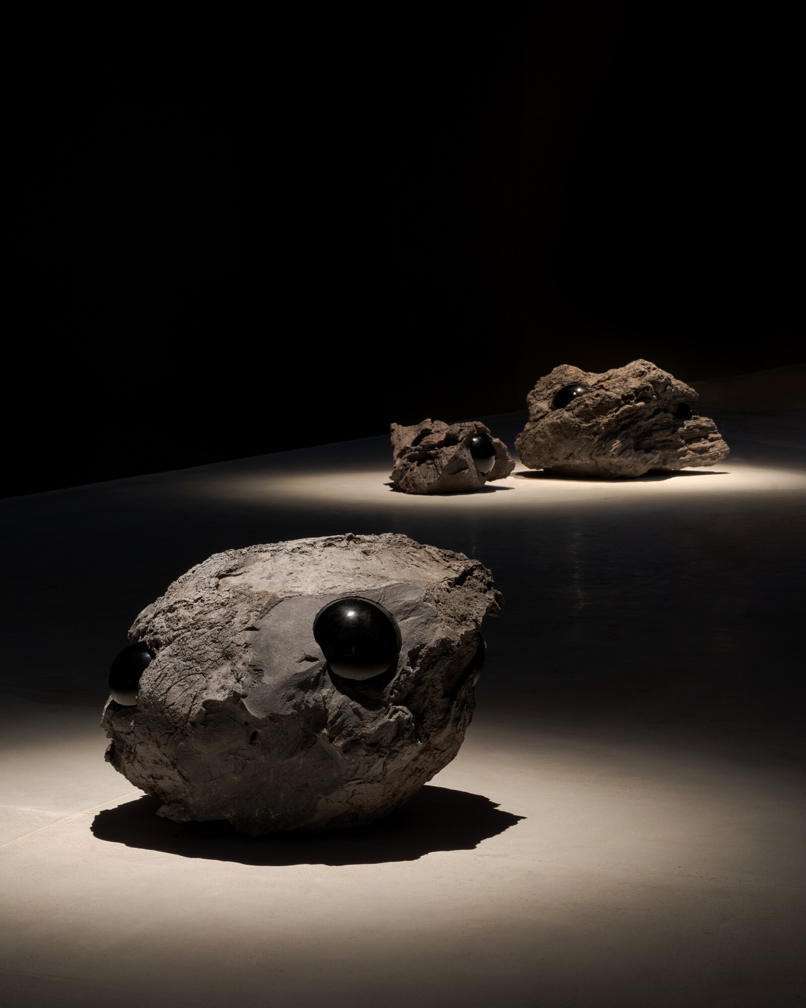 The installation Panchronic Garden (2022) recreates a Carboniferous forest, bringing ancient plants to life on a floor of anthracite coal. The film Controlled Burn (2022) builds on this theme, contrasting explosive pyrotechnics with images of derelict oil rigs and decommissioned cooling towers, showing how this journey began with the very plants in Panchronic Garden. The work A Stone Dream of You (2024) brings this meditation back to the origins of life itself, with lava stone sculptures that evoke the primordial beginnings of life emerging from geological forces.