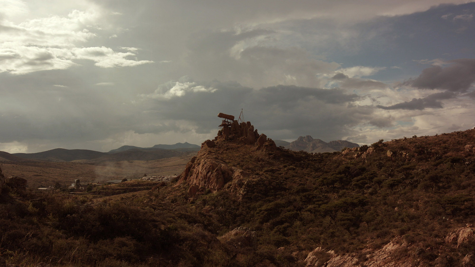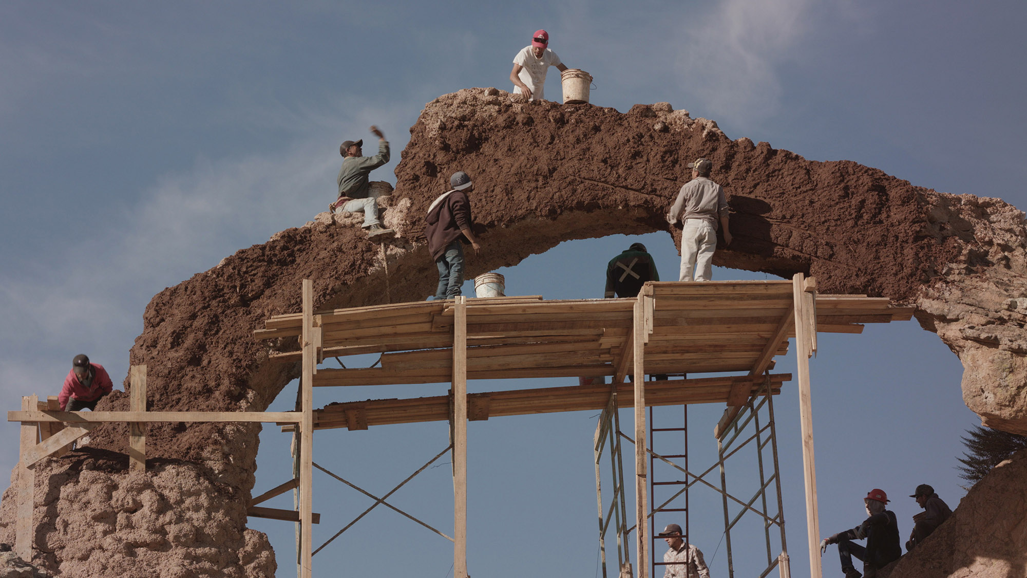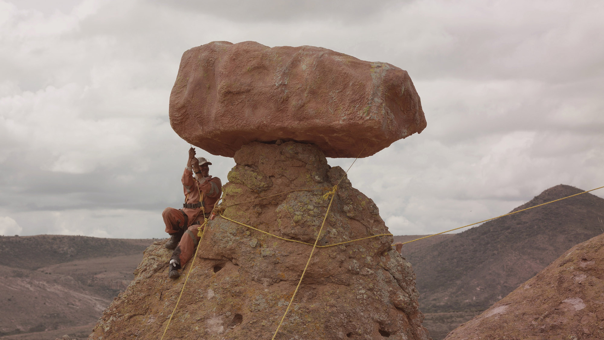 In a staged terrorist act, the two artists Julian Charrière and Julius von Bismarck blow up a vaulted rock formation. A video recorded with a mobile phone shows the masked "perpetrators" on the run to safety. The actual explosion of the arch, however, does not take place in Utah as faked, but in Mexico, with an artificial counterpart. In a very detail-oriented process, the arch is reproduced with colored concrete. The explosion is staged in a controlled manner with the help of a local production team.