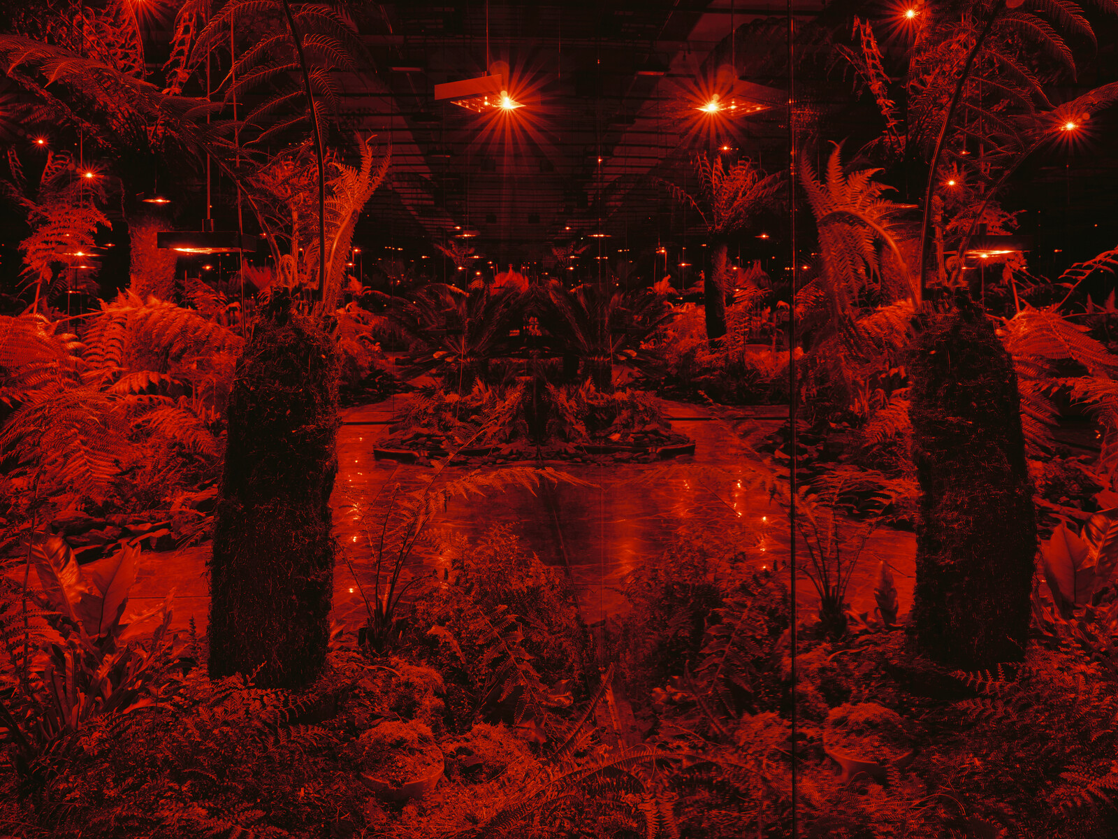 Panchronic Garden walks the visitor back, or perhaps forwards, in time, lapsing occasionally into stroboscopic flashes. Within these bright breakages, the forest is again revealed as green, and mirror walls lapse into infinity: building a cosmic bridge between seed and coal seam.