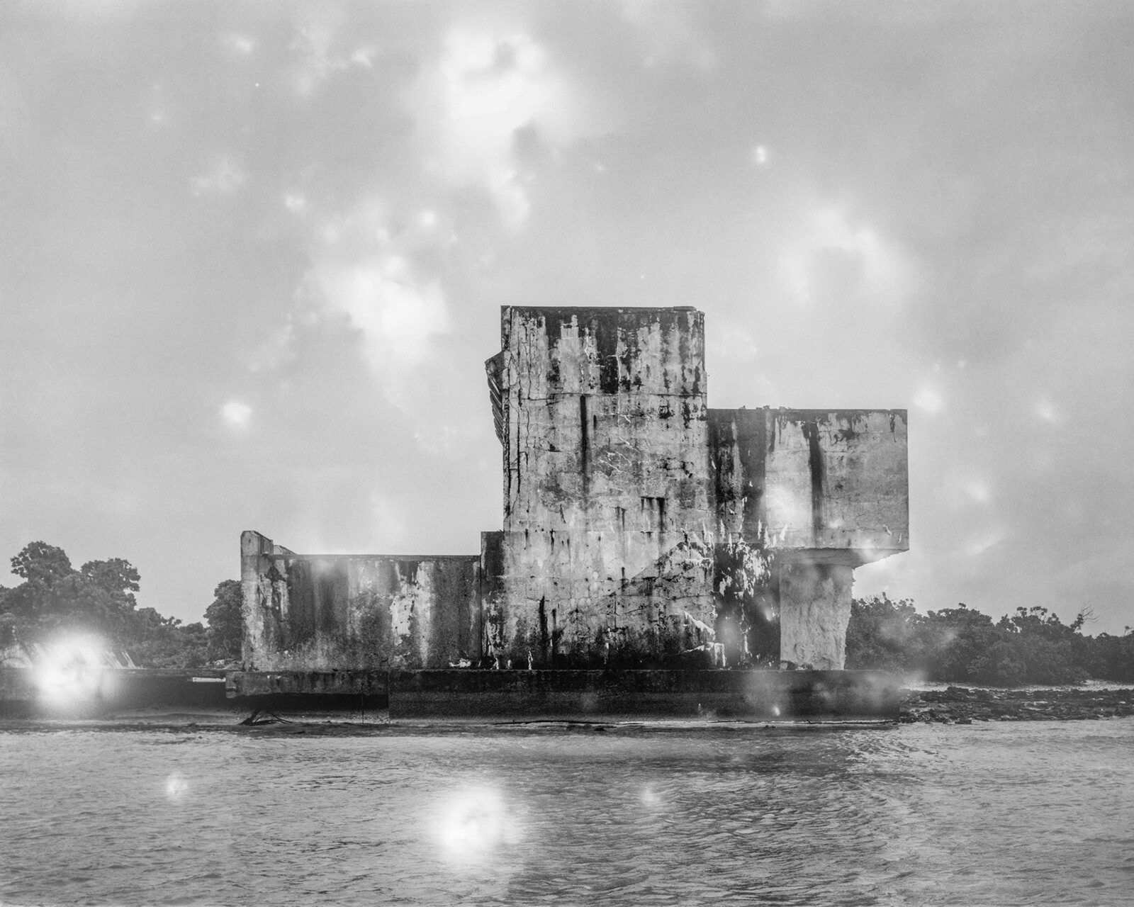 Like Charrière's series Polygon, these black and white works recall the objective style of the Dusseldorf School while surveying the apotheosis of mid-century atomic-industrial architecture. With their rusting iron rebar and crumbling concrete, now falling like flakes – prey to salt air and, once, unimaginable vibrations - some of these structures recall pyramids; odious leftovers of a questionable ideal.Aomen II - Terminal Beach, 2016
